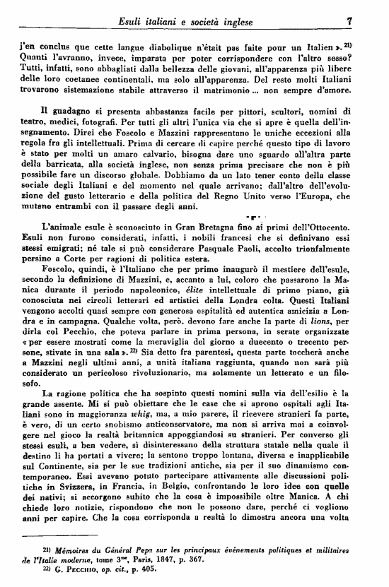 Foscolo, quindi, è l'Italiano che per primo inaugurò il mestiere dell'esule, secondo la definizione di Mazzini, e, accanto a lui, coloro che passarono la Manica durante il periodo napoleonico, élite intellettuale di primo piano, già conosciuta nei circoli letterari ed artistici della Londra colta. Questi Italiani vengono accolti quasi sempre con generosa ospitalità ed autentica amicizia a Londra e in campagna. Qualche volta, però, devono fare anche la parte di lions, per dirla col Pecchio, che poteva parlare in prima persona, in serate organizzate per essere mostrati come la meraviglia del giorno a duecento o trecento persone, stivate in una sala .a) Sia detto fra parentesi, questa parte toccherà anche a Mazzini negli ultimi anni, a unità italiana raggiunta, quando non sarà più considerato un pericoloso rivoluzionario, ma solamente un letterato e un filosofo.