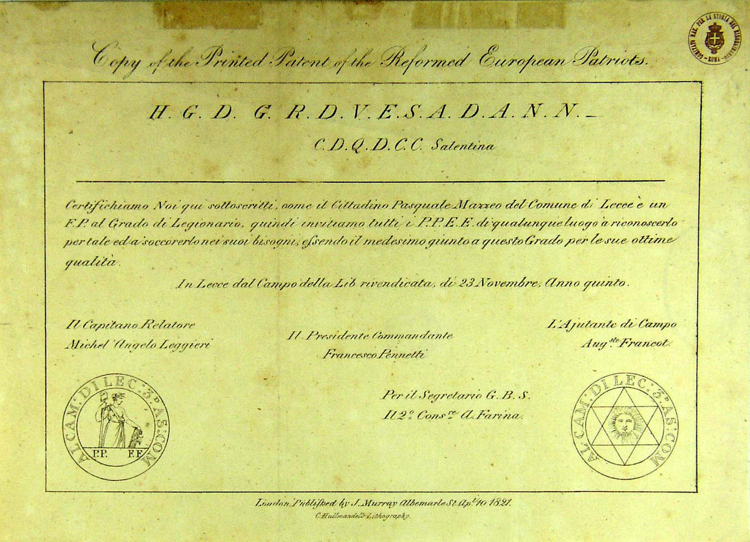 Copy of the printed Patent of the Reformed European Patriots |