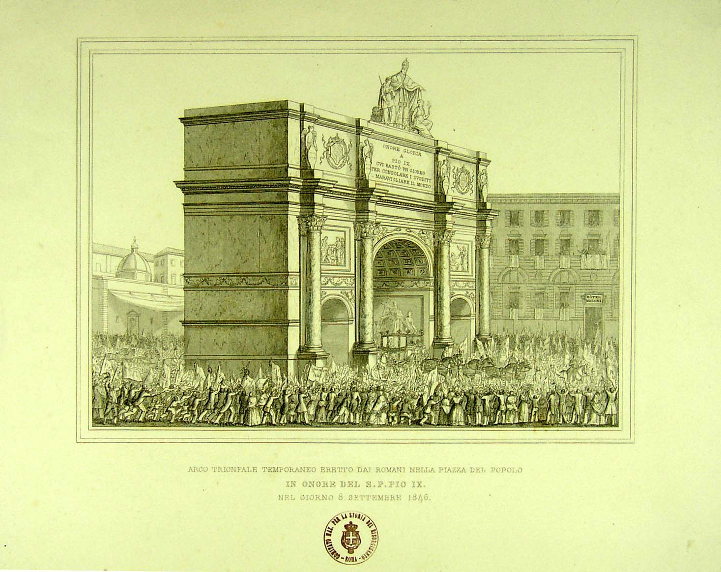 Arco trionfale temporaneo eretto dai romani nella Piazza del Popolo in onore del S.P. Pio IX, nel giorno 8 Settembre 1846 |