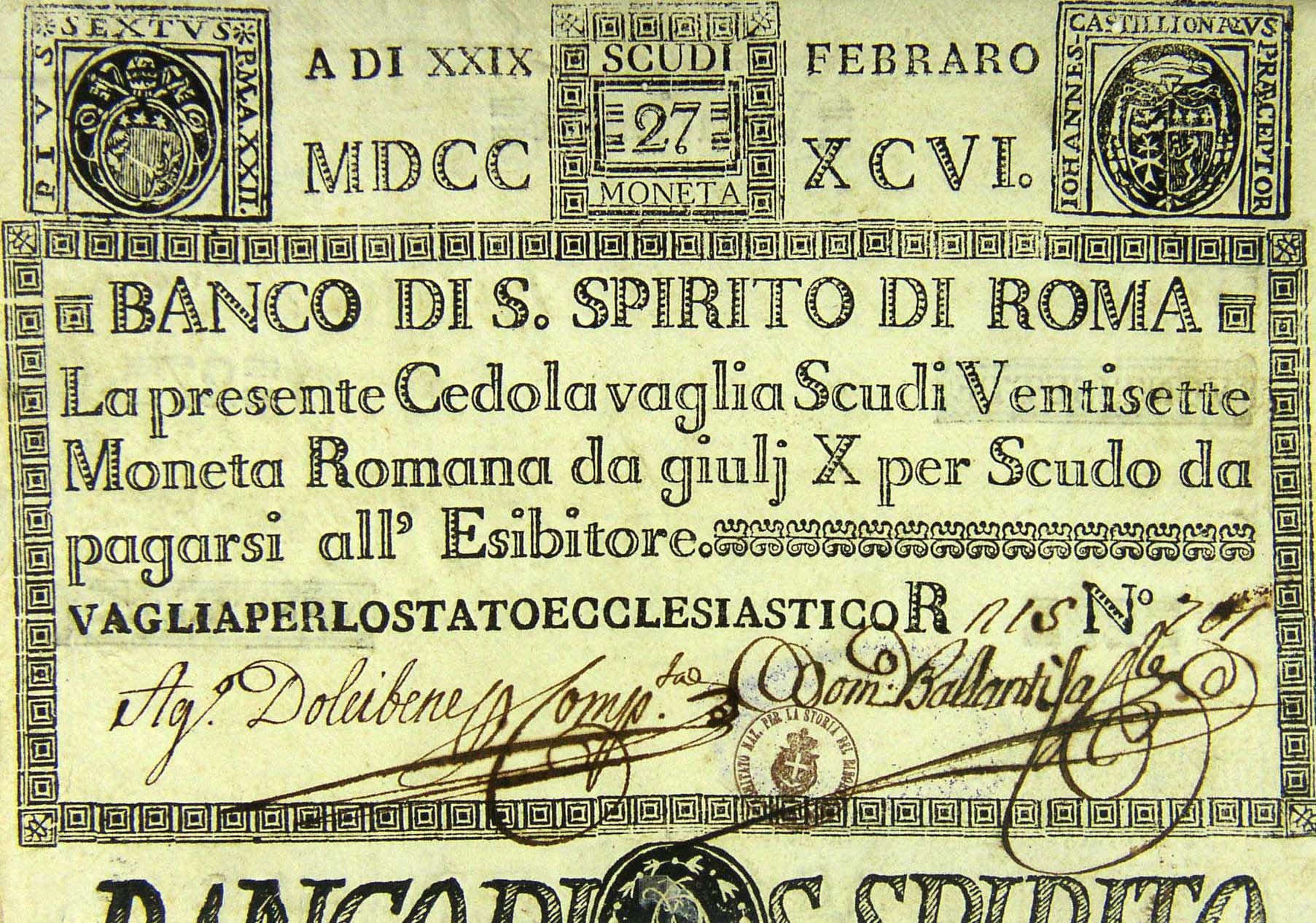 Carta moneta del Banco di Santo Spirito di Roma, 27 Scudi romani