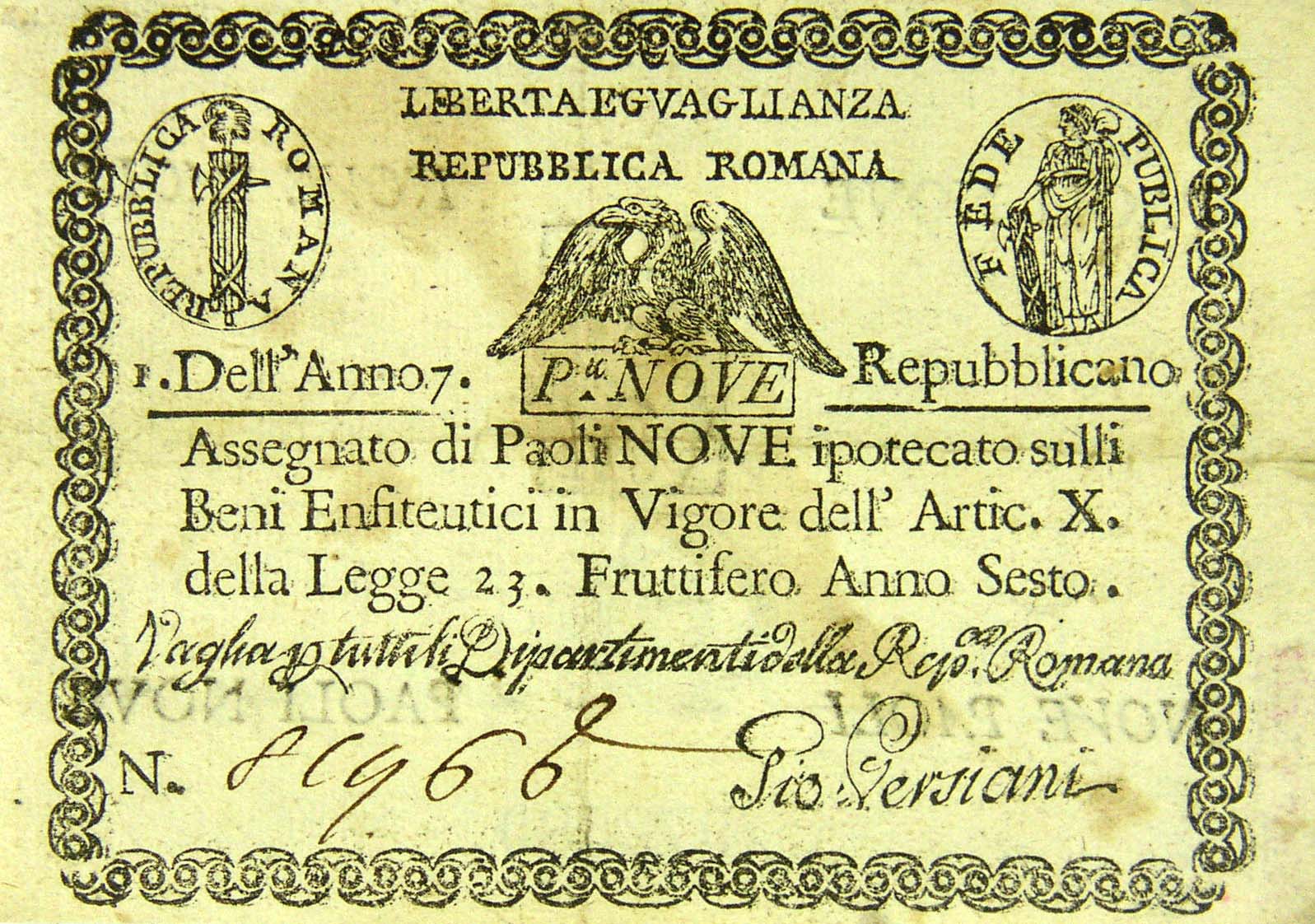 Carta moneta della Repubblica Romana, 9 Paoli |