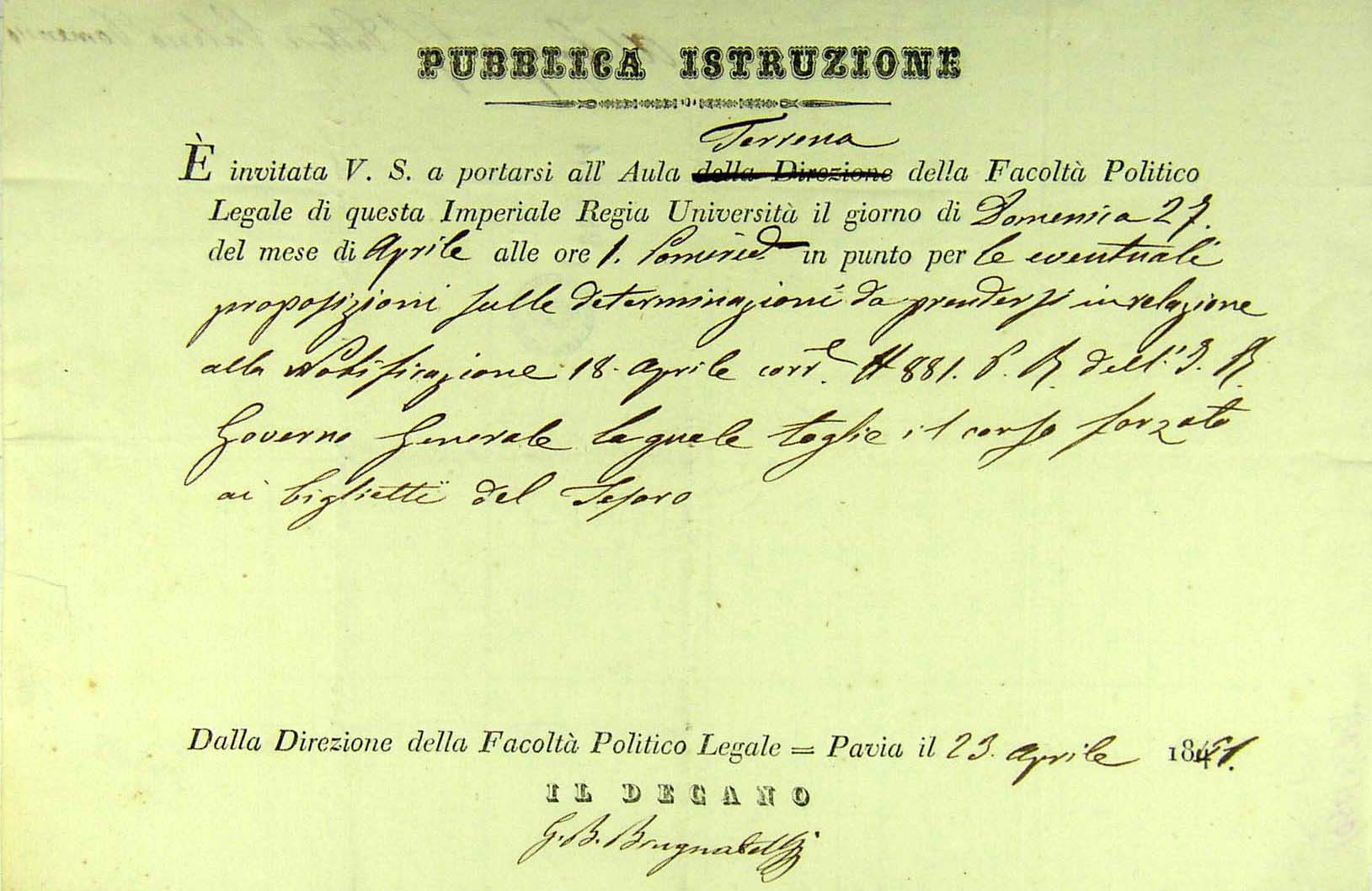 Invito dell´università di Pavia ai funerali del dottor Pietro Tamburini