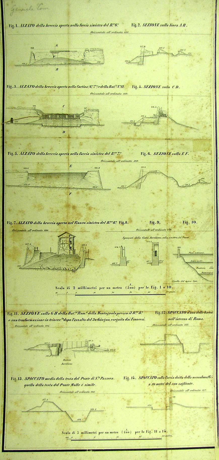 Sezione, spaccato e alzato delle breccie sulle mura di Roma nel 1849