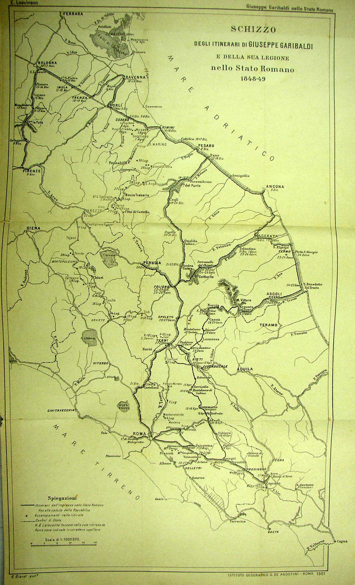 Schizzo degli itinerari di Giuseppe Garibaldi e della sua legione nello Stato Romano