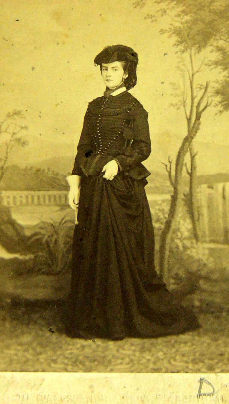 Maria Sofia indossa un abito con giacca simile ad unŽuniforme. Il fondale riproduce una veduta di Roma con acquedotto. Confronta con foto A217 - |