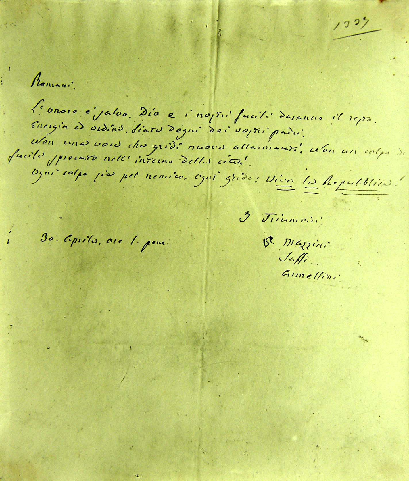 Foglio manoscritto della Repubblica Romana e firmato dal triumvirato: Armellini, Mazzini, Saffi |