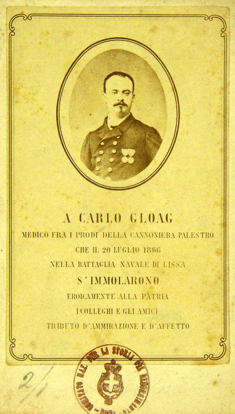 A Carlo Gloag medico fra i prodi della cannoniera Palestro che il 20 luglio 1866 nella battaglia navale di Lissa s“immolarono eroicamente alla patria. I colleghi e gli amici tributo d“ammirazione e d“affetto |
