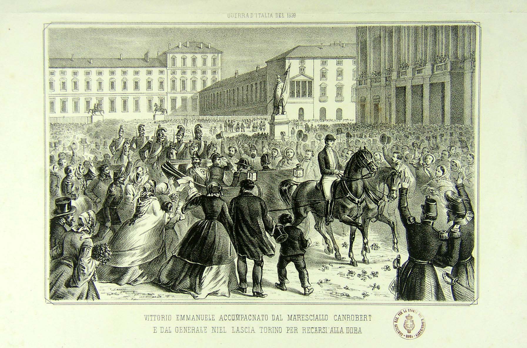 Vittorio Emanuele accompagnato dal Maresciallo Canrobert e da Generale Niel lascia Torino per recarsi alla Dora |
