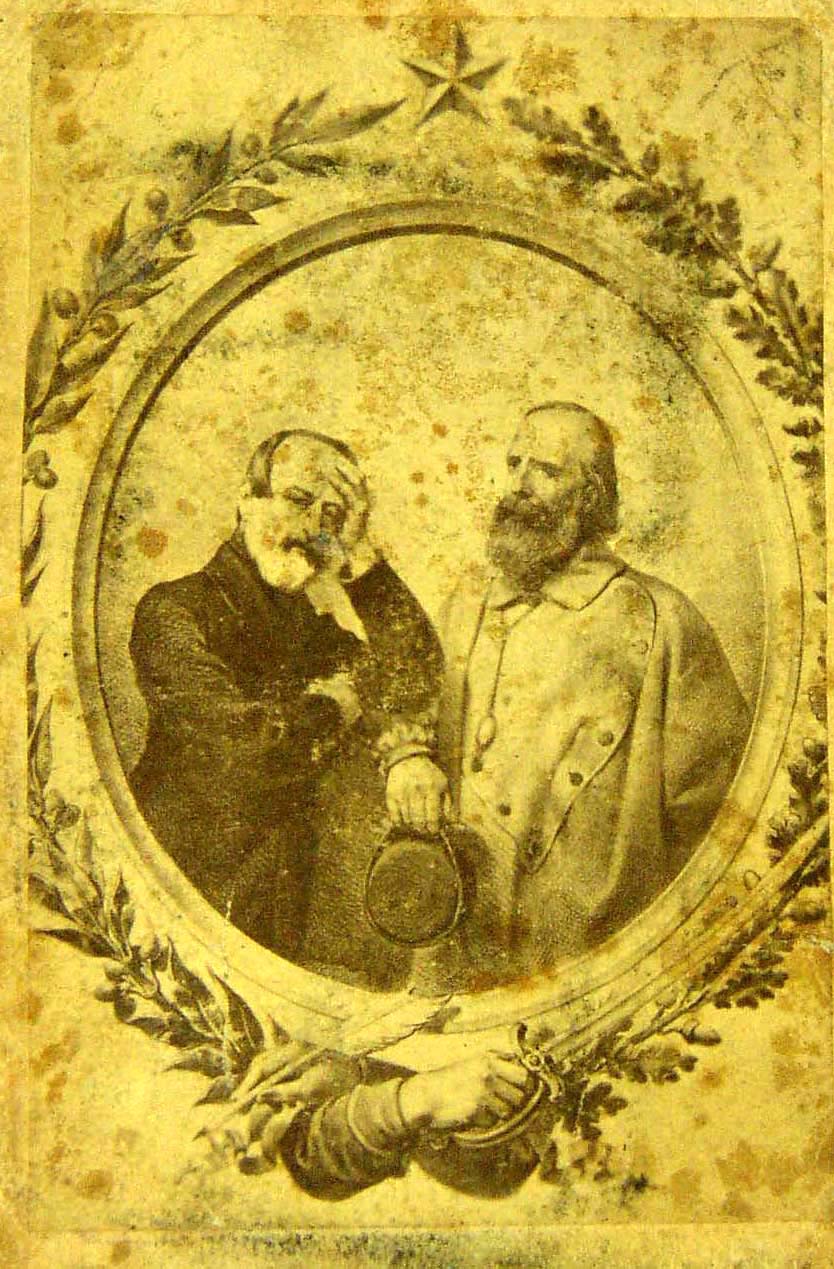 Fotografia ritoccata a mano. Garibaldi e Mazzini sono inseriti all´interno di una cornice con serto di ulivo e quercia terminante con due mani impugnanti una spada e una penna - |
