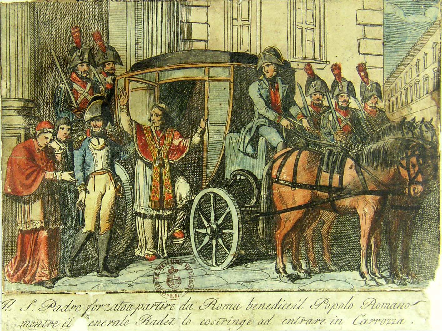 Il Santo Padre forzato a partire da Roma, benedice il popolo romano, mentre il Gen. Radet lo costringe ad entrare in carrozza |