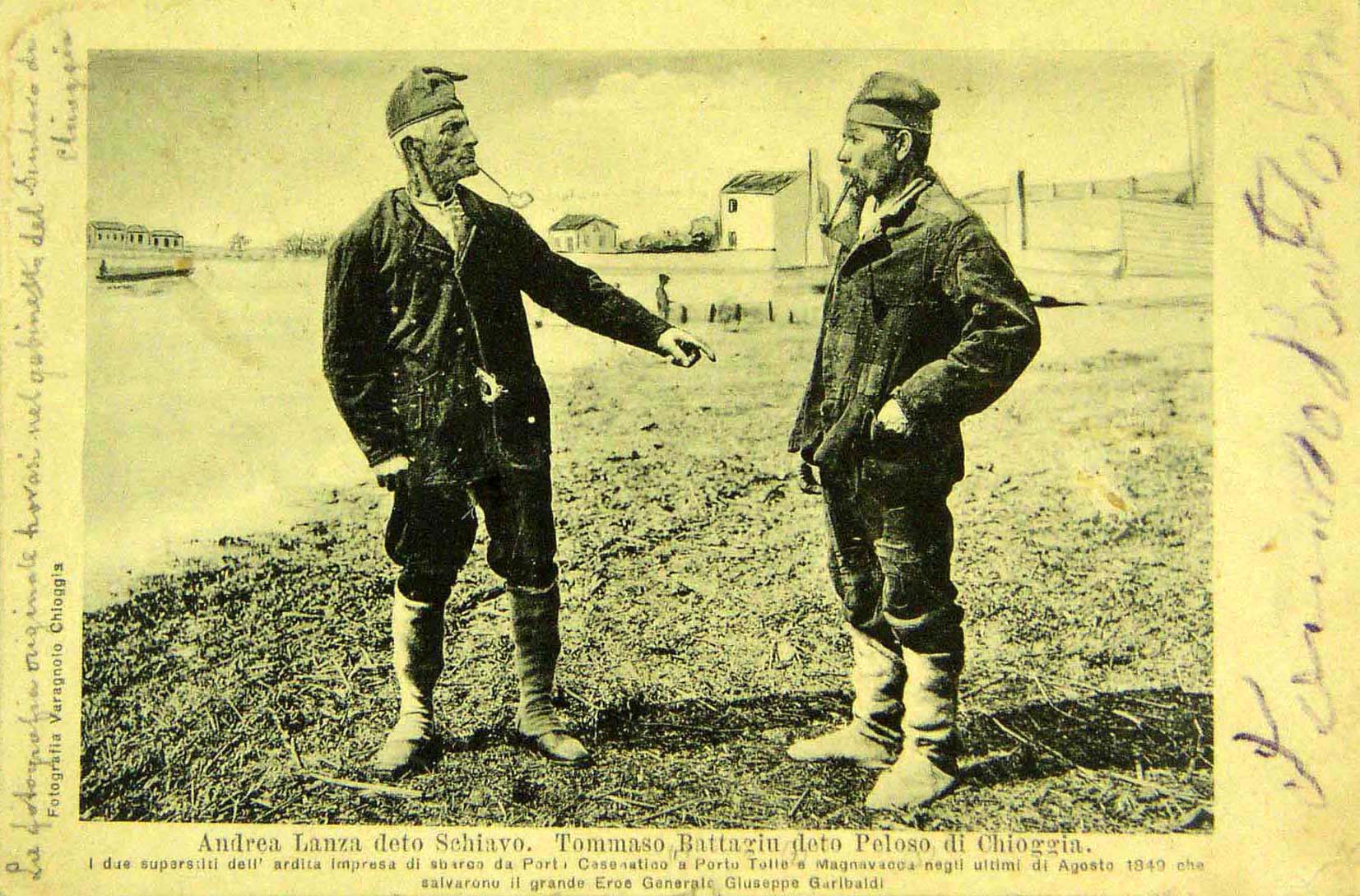 Andrea Lanza deto Schiavo. Tommaso Battaggiu deto peloso di Chioggia. I due superstiti dell´ardita impresa di sbarco da Porto Cesenatico a Porto Tolle e Megnavacca negli ultimi di Agosto 1849 che salvarono il grande Eroe Generale Giuseppe Garibaldi |