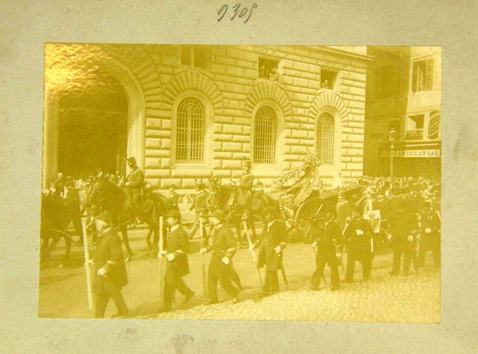 ** La foto riprende il corteo funebre del Generale Cosenz [morto il 28 settembre 1898 a Roma] mentre sfila per via Nazionale a Roma. Il feretro, con sopra l“elmo piumato del generale, come da prassi poggia su un affusto di cannone ed č trainato da 3 coppie di cavalli neri guidati da militari dell“artiglieria ippotrainata. Sul carro poggia una grande corona di fiori con una fscia con scritto “Umberto I all“amico Cosenz“ - |