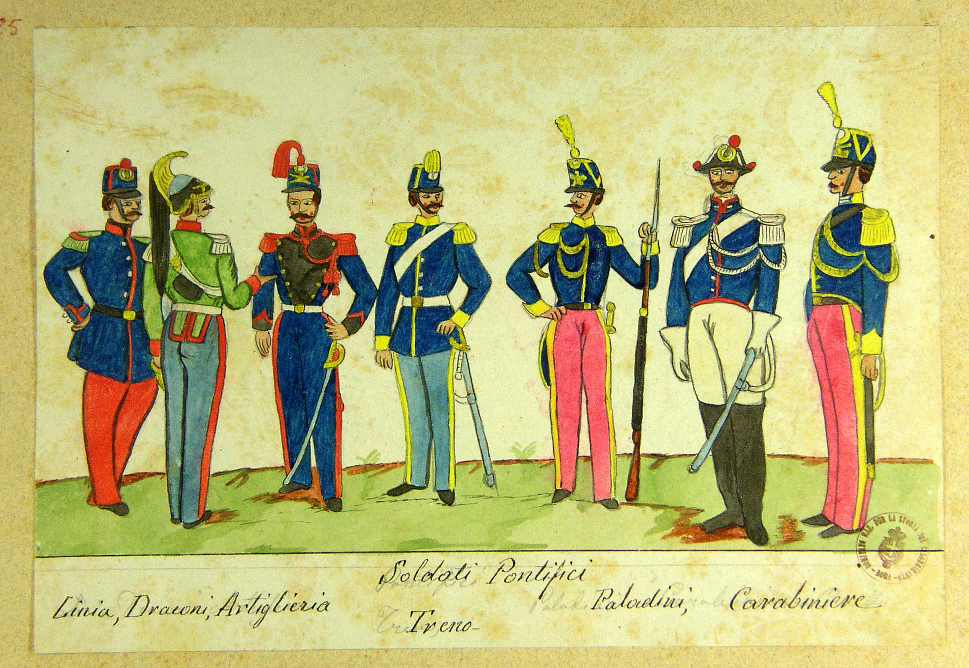 Soldati Pontifici. Linia, Dragoni, Artiglieria, Treno, Paladini, Carabinieri