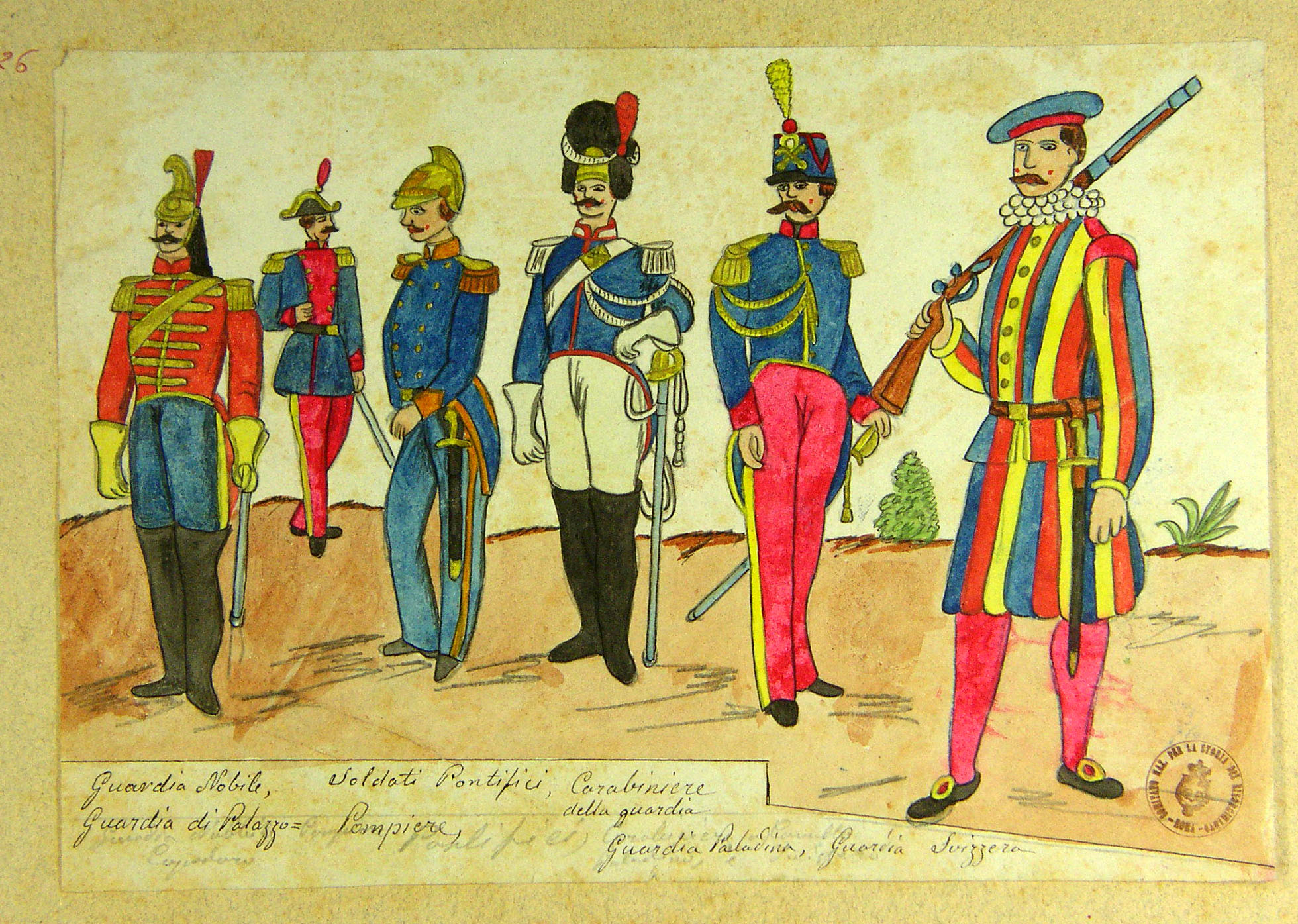 Soldati Pontifici. Guardia Nobile, Guardia di Palazzo, Pompiere, Carabiniere della Guardia Paladina, Guardia Svizzera |