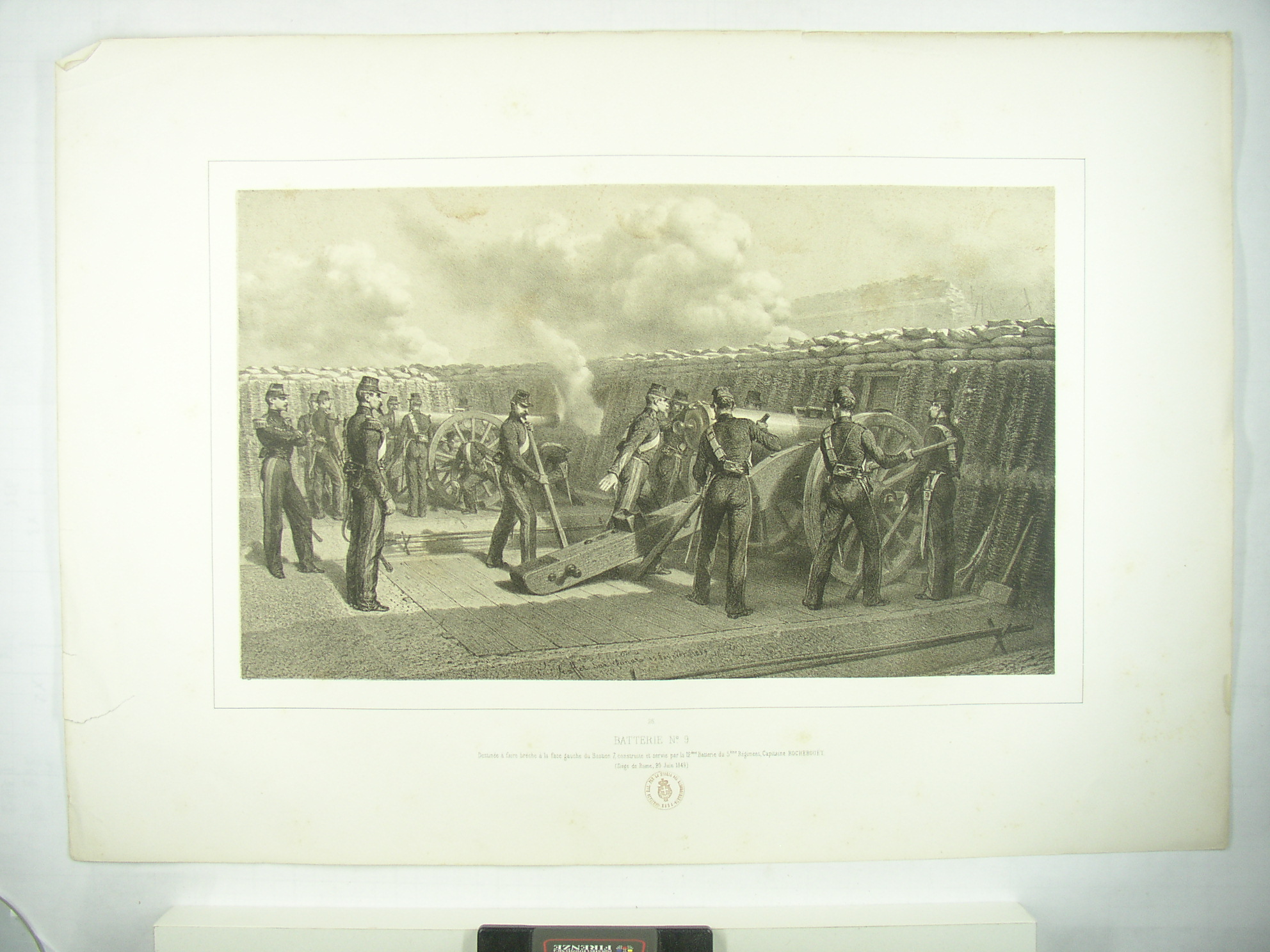 Batterie N° 9. Destinée à faire brèche à la face gauche du Bastion 7, construite et servie par la 12 ème. Batterie du 5 ème. Regiment, Capitaine Rochebouet. (Siège de Rome, 20 Juin 1849) |