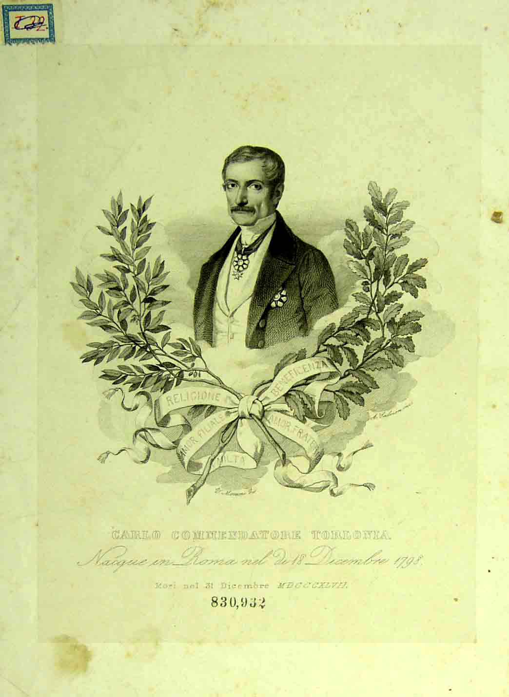 Carlo Commendatore Torlonia. Nacque in Roma nel di 18 Dicembre 1798. Moŕ nel 31 Dicembre 1847 |