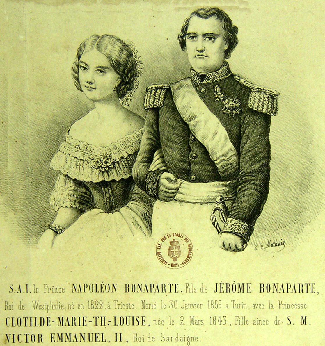S. A. I. le Prince Napoléon Bonaparte, Fils de Jérome Bonaparte, Roi de Wstphalie, nè en 1822, à Trieste, Mariè le 30 Janvier 1859, à Turin; avec la Princesse Clotilde-Marie-Th.-Louise, nèe le 2 Mars 1843, Fille ainèe de S. M. Victor Emmanuel, II, Roi de Sardaigne |