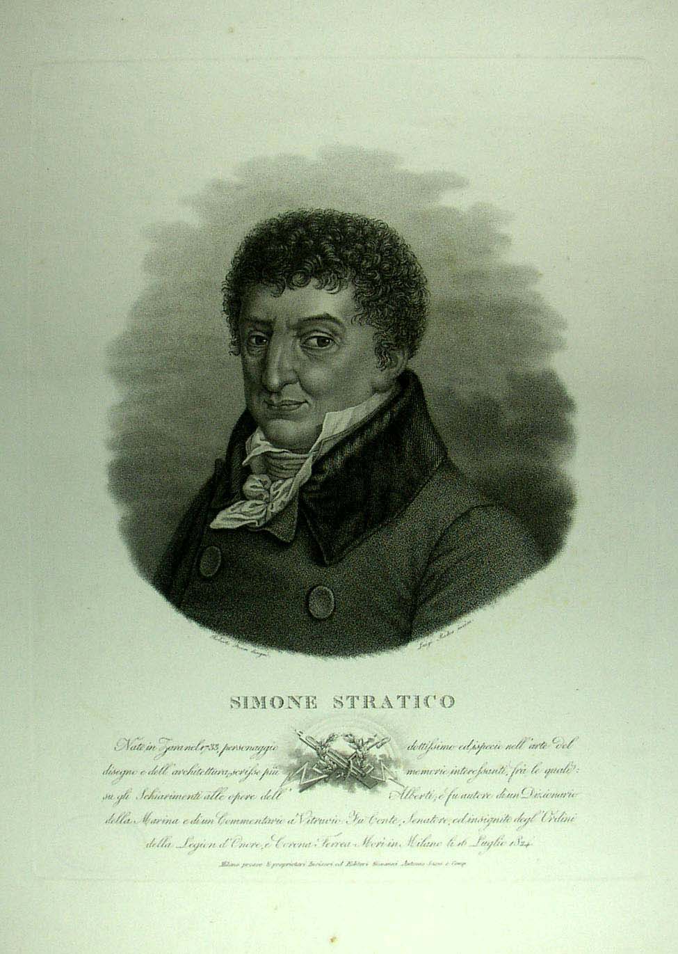 Recto: Simone Stratico, nato in Zara nel 1733, personaggio dottissimo ed ispecie nell'arte del disegno e dell'architettura; Scrisse più memorie interessanti fra le quali: Su gli schiarimenti alle opere dell'Alberti; E fu autore di un dizionario della Marina e di un commentario a Vitruvio. Fu Conte, Senatore, ed insignito degli ordini della Legion d'Onore, e Corona Ferrea, morì in Milano li 16 Luglio 1824 |
