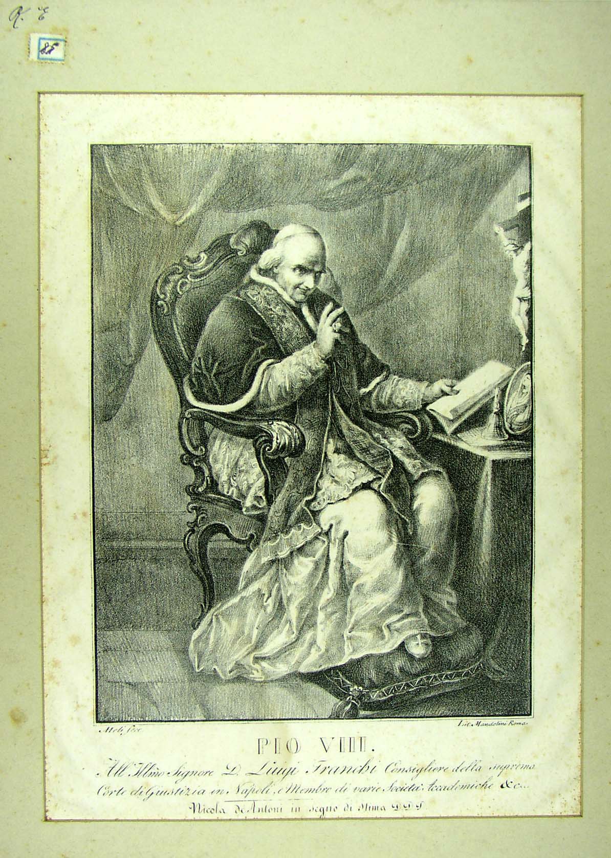 Pio VIII. Al Il.mo Signore D. Luigi Franchi Consigliere della SUprema Cosrte di Giustizia [...] Nicola de Antoni in segno di Stima D.D.D. |