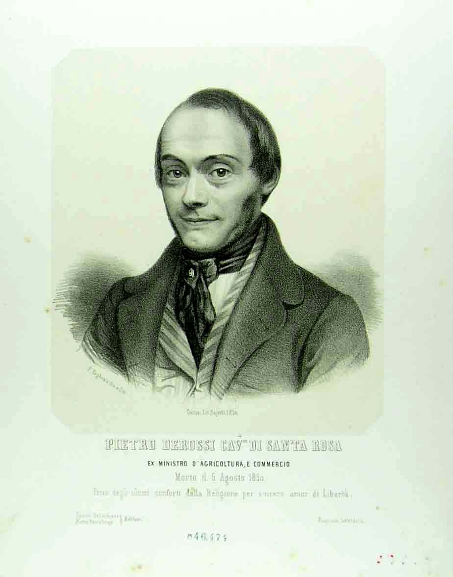 Pietro Derossi Cav.re di Santa Rosa. Ex MInistro d'Agricoltura, e Commercio. Morto il 6 agosto 1850. Privo degli ultimi conforti della Religione per sincero amor di Libertà