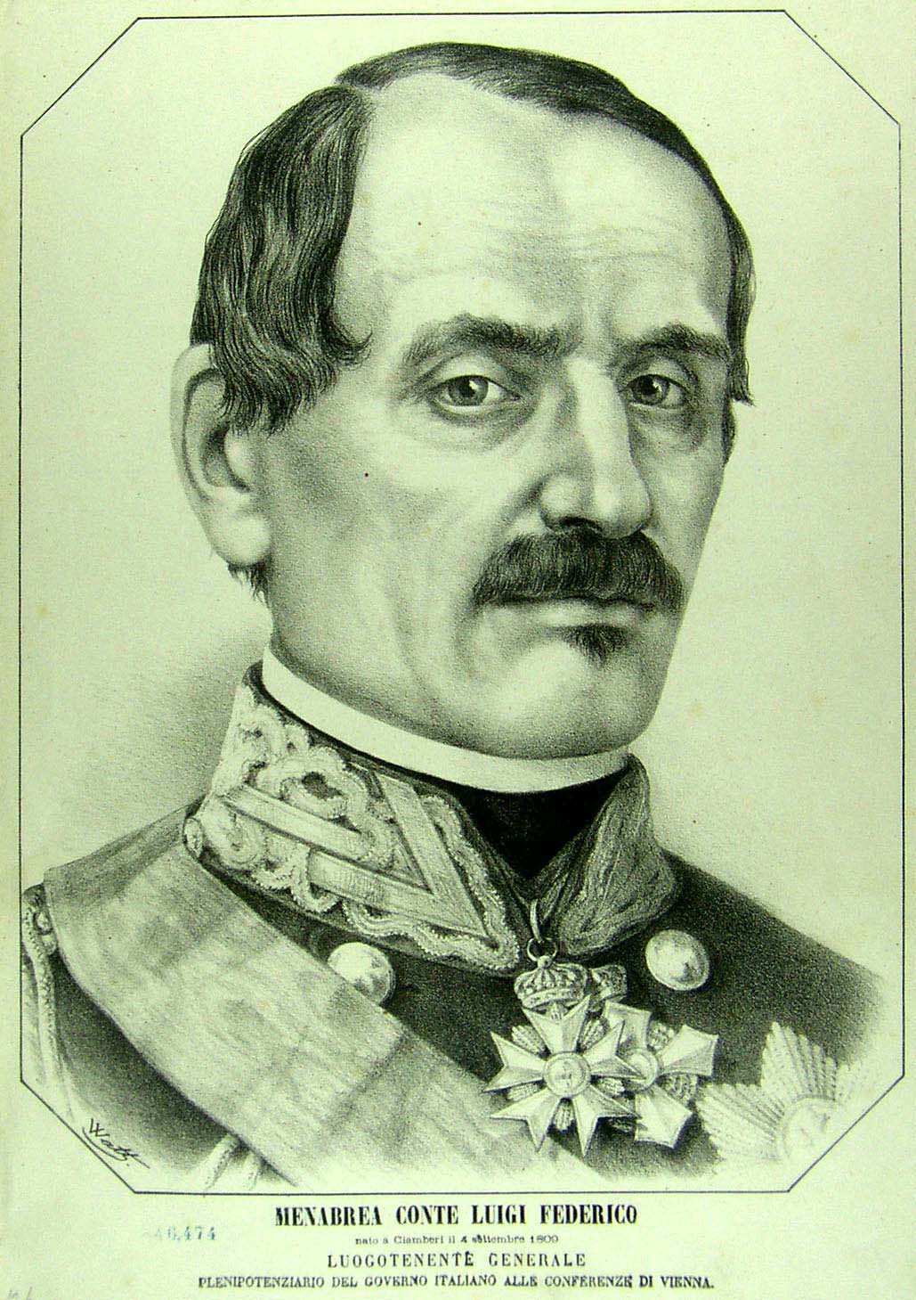 Menabrea conte Luigi Federico nato a Ciamberi il 4 settembre 1809. Luogotenente generale Plenipotenziario del Governo italiano alle conferenze di Vienna