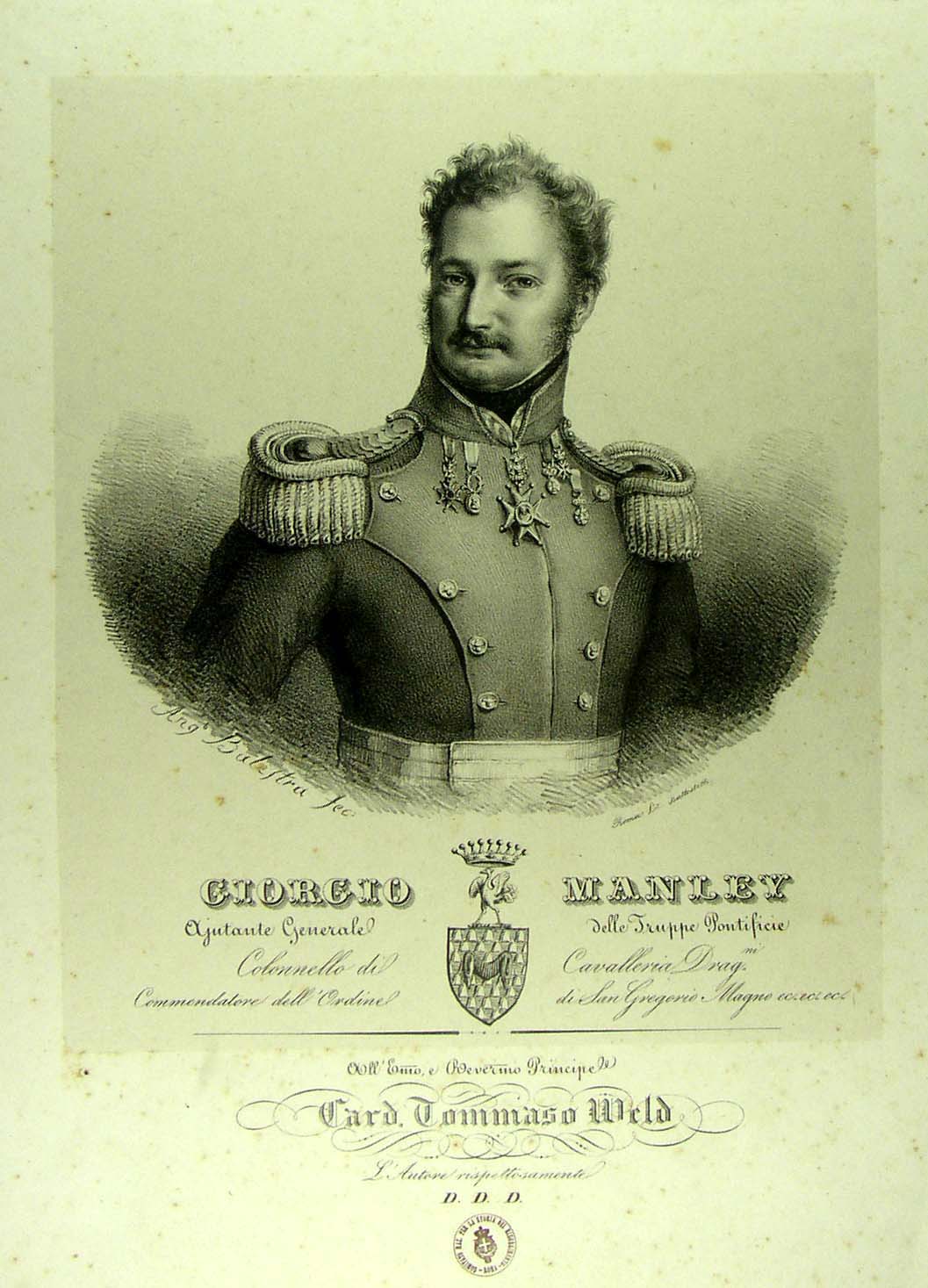 Giorgio Manley. Ajutante Generale delle Truppe Pontificie [...] All'E.mo e Reve.mo Principe Card. Tommaso Weld L'Autore rispettosamente D.D.D. |