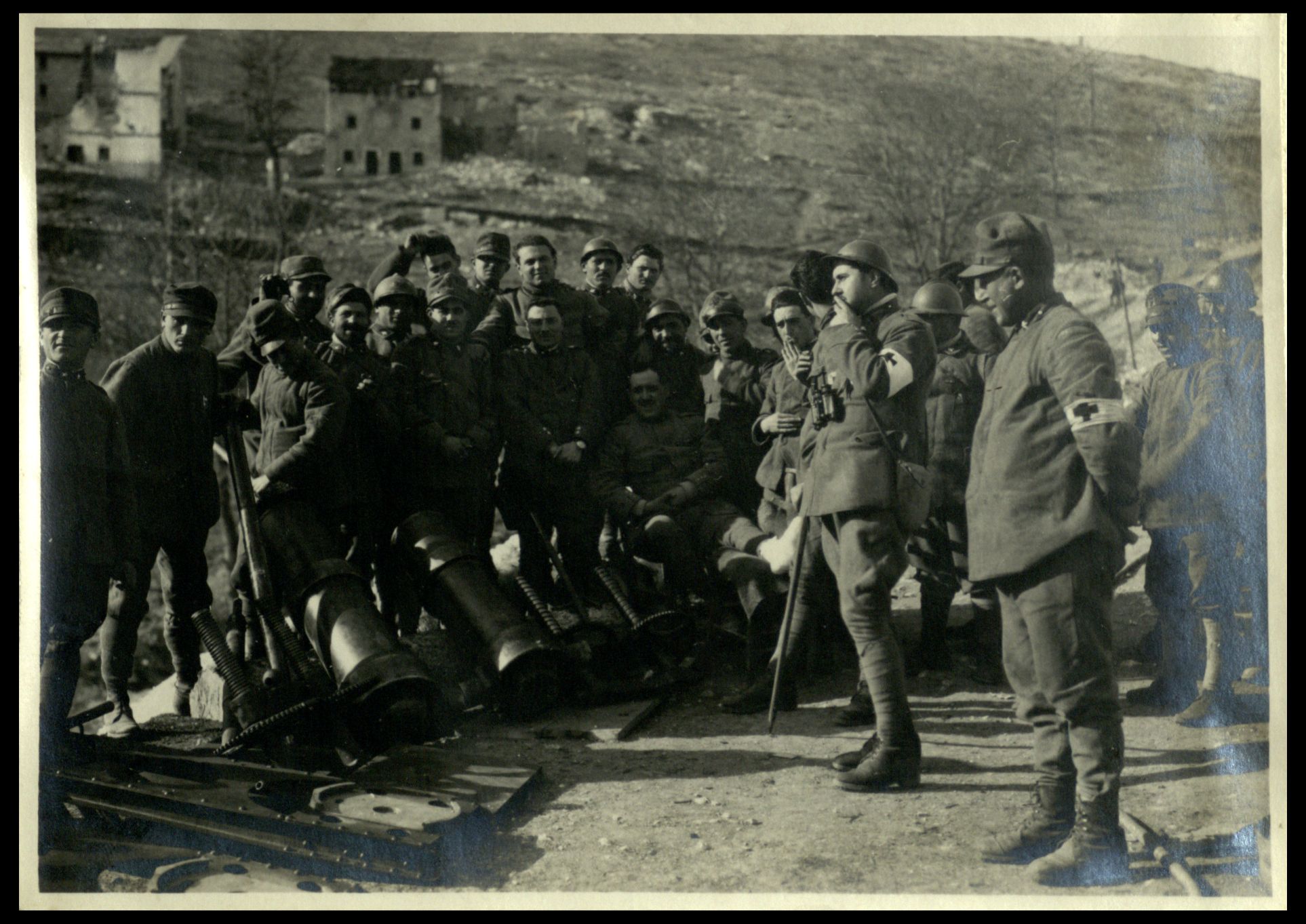 Bombarde catturate nell'abitato di Stoccaredo e bombardieri che le catturano. |