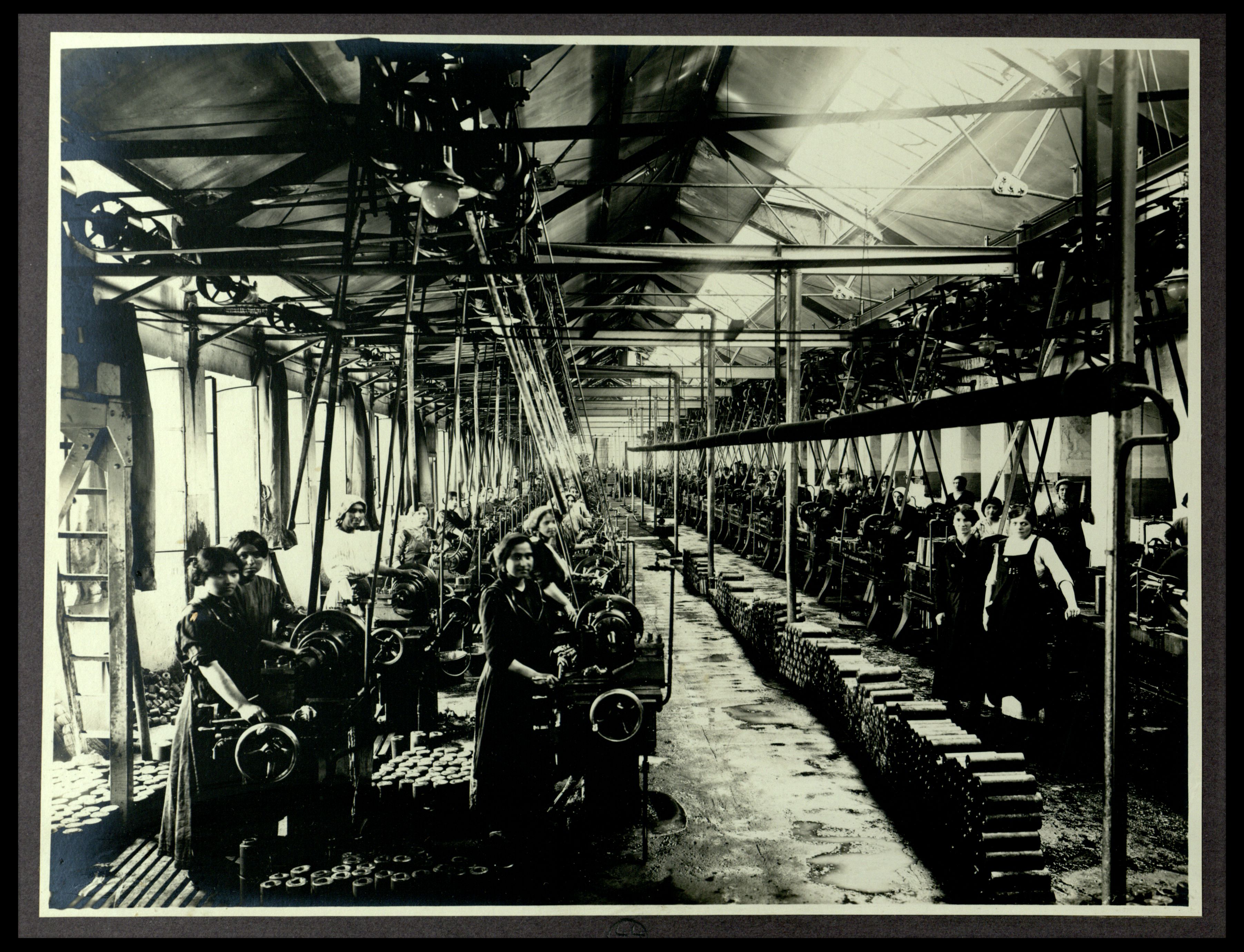 Veduta del riparto femminile della torneria. Lavorazione delle granate di piccolo e medio calibro |
