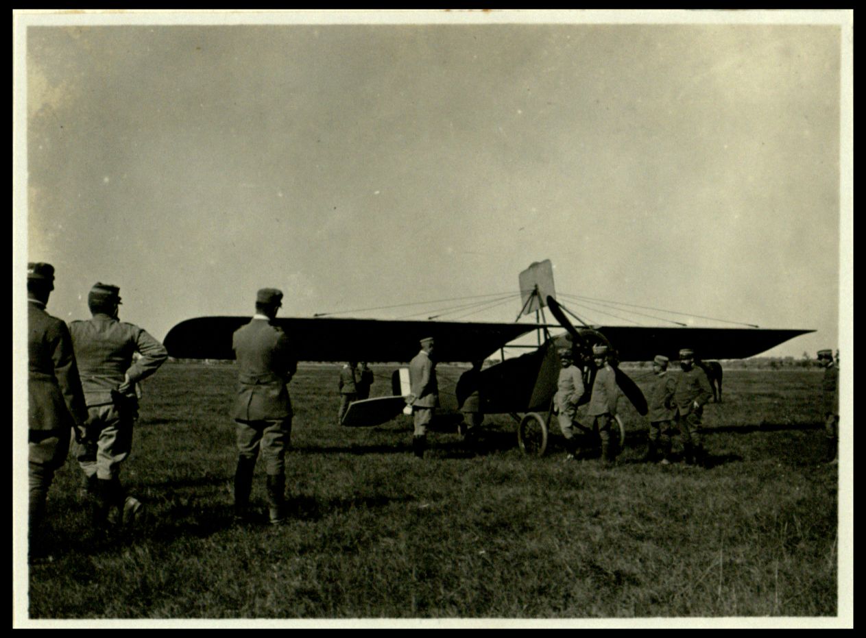 Aeroplano fermo sul prato, circondato da soldati. |