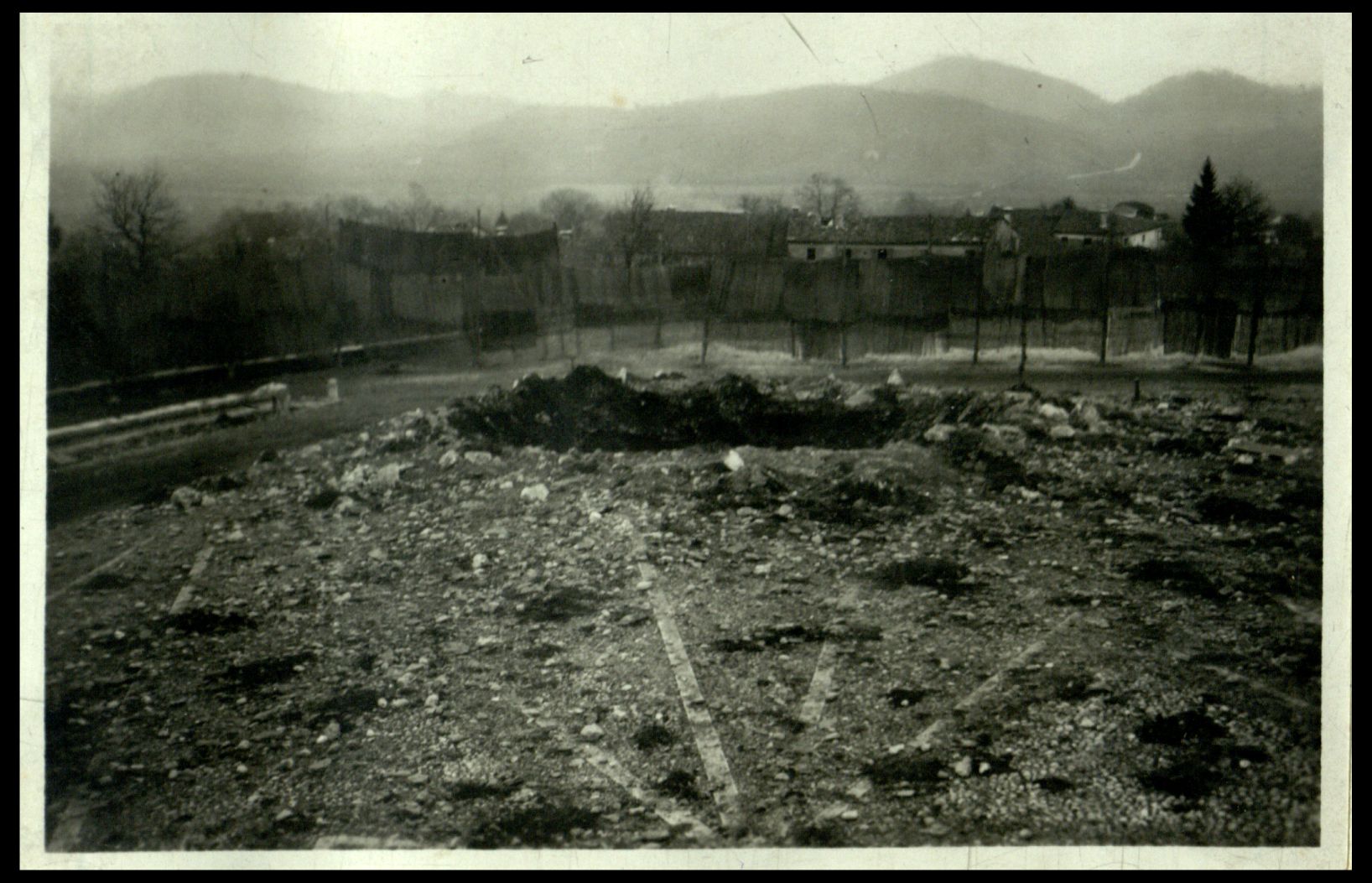 Il cratere di un grosso proiettile davanti la gipsoteca di Possagno. |