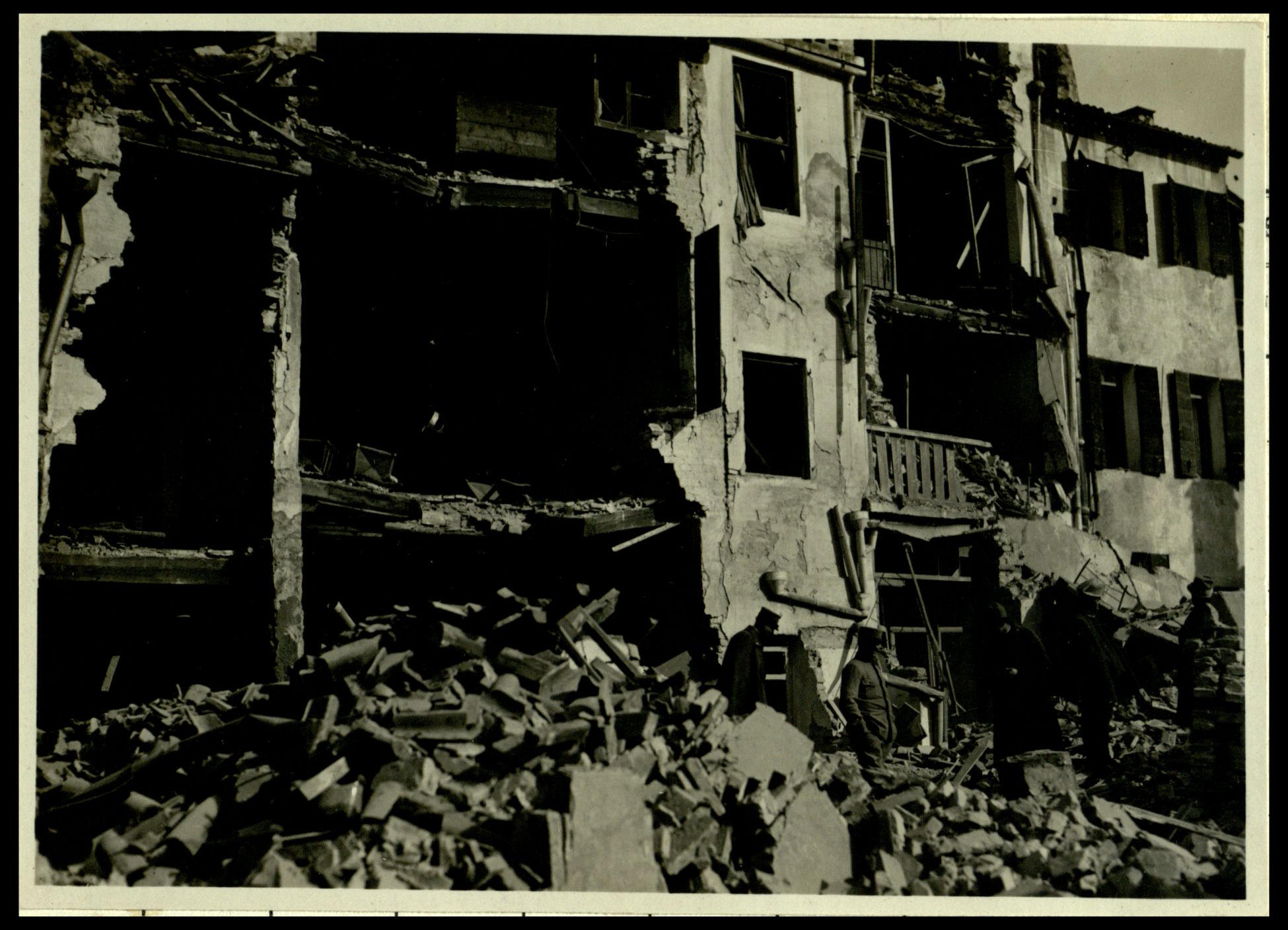 Scorcio di case bombardate a Padova con soldati e civili tra le macerie. |