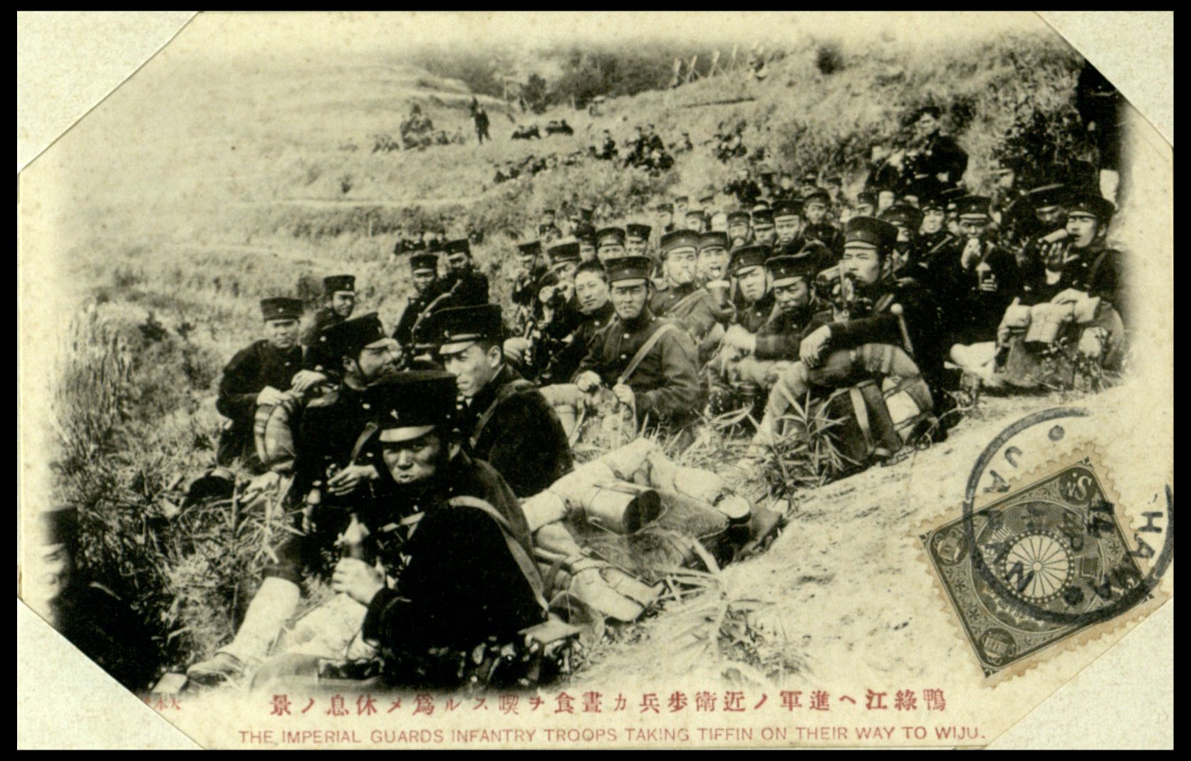 The imperial guards infantry troops taking tiffin on their way to Wiju |