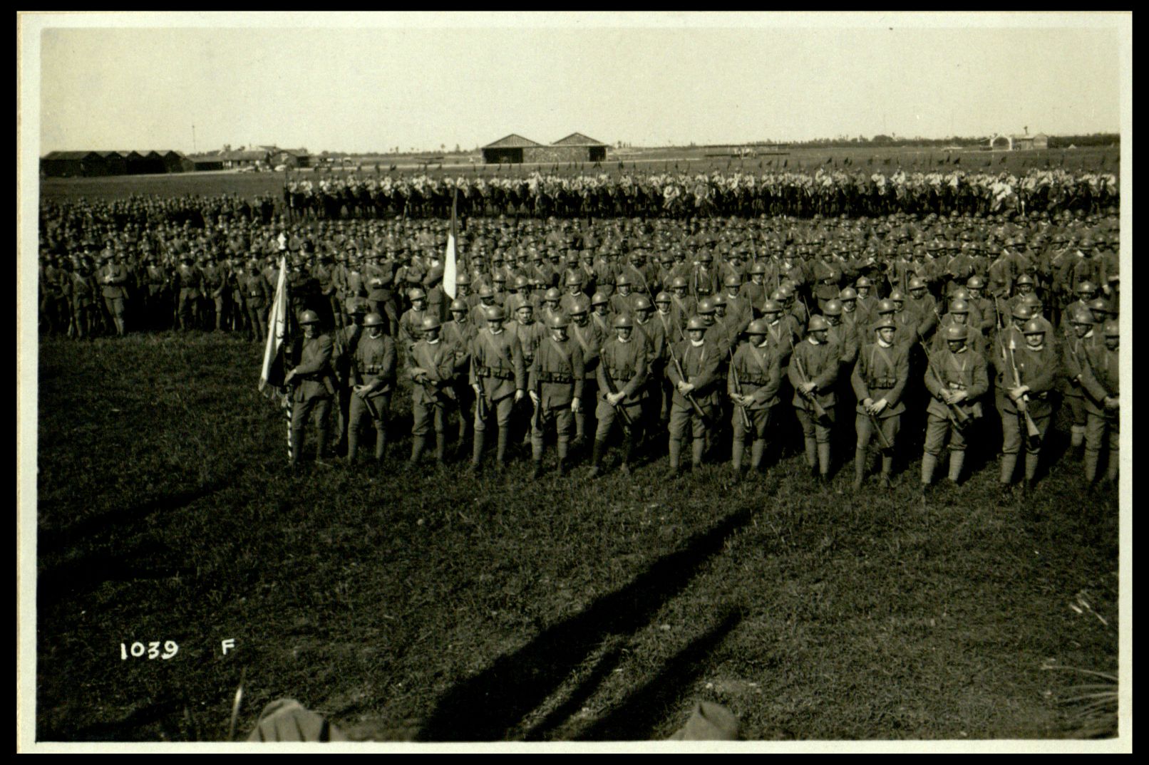 Cerimonia ufficiale. Consegna medaglie al campo d'aviazione di Sitrano da S.E. il generale Pennella, comandante la 2° armata. 20/5/1918. Durante la cerimonia al campo |