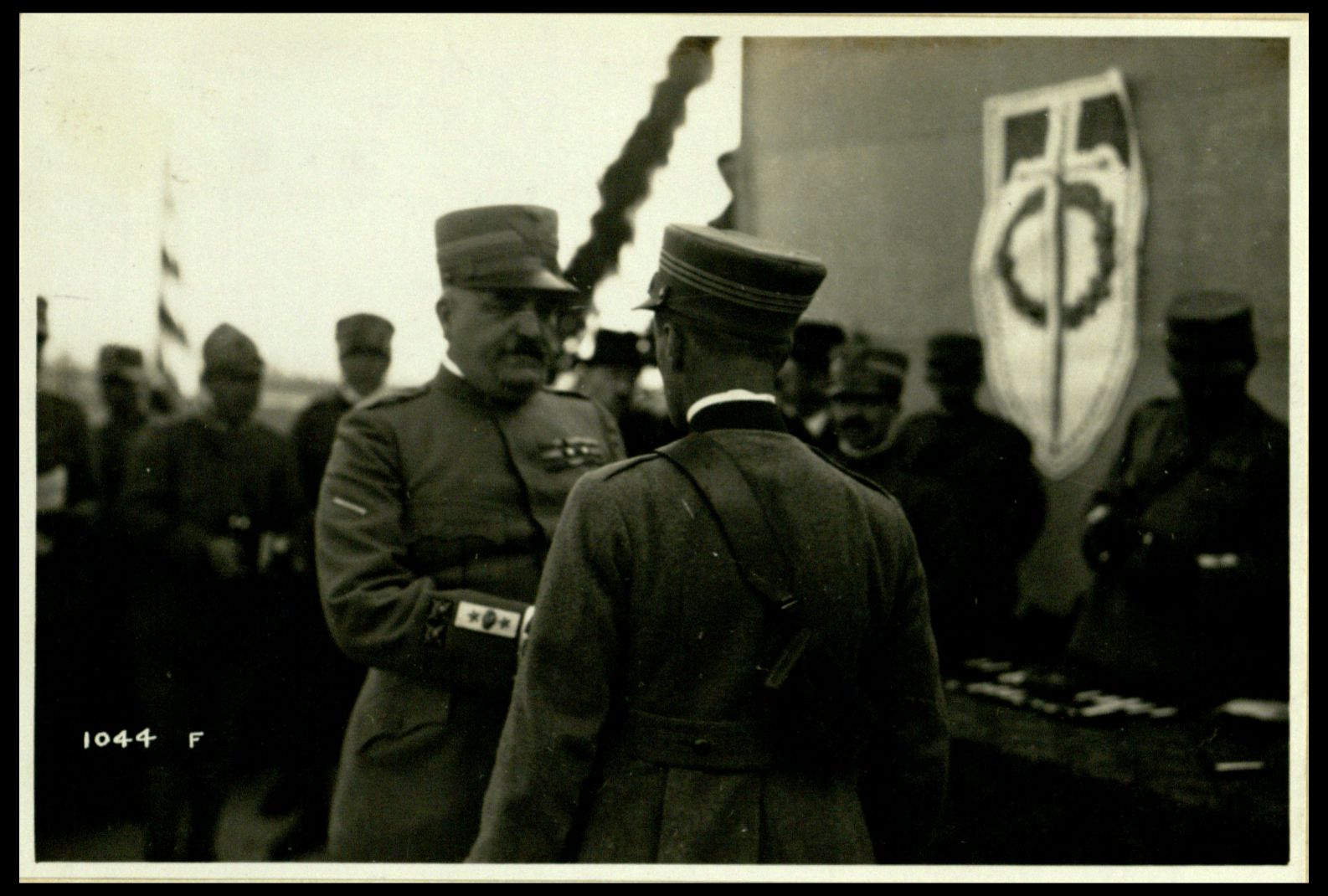 Cerimonia ufficiale. Consegna medaglie al campo d'aviazione di Sitrano da S.E. il generale Pennella, comandante la 2° armata. S.E. il generale Pennella parla ad un capitano decorato |