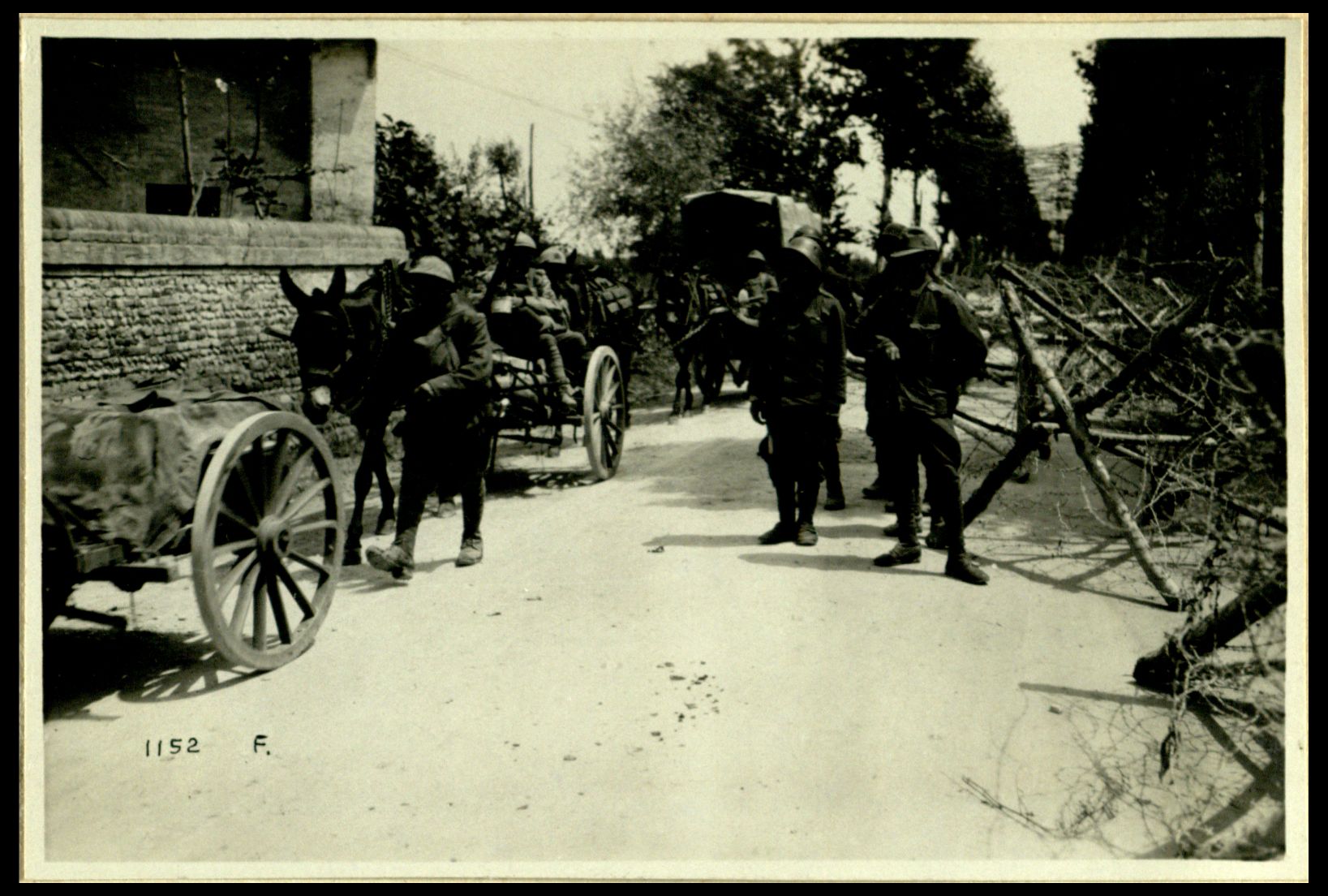 Offensiva austriaca sul Piave del giugno 1918. 15 giugno 1918. Presso Olmi di S.Floriano. Salmerie verso le linee e prigionieri appena catturati |