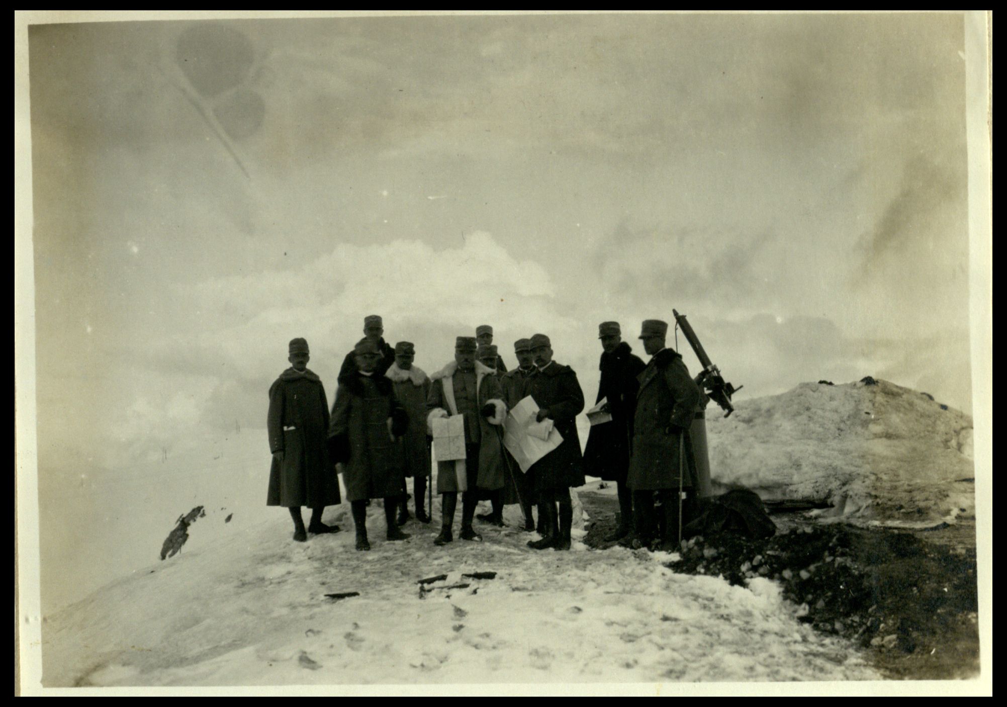 Il generale Lugi Cadorna tra un gruppo di ufficiali e soldati |