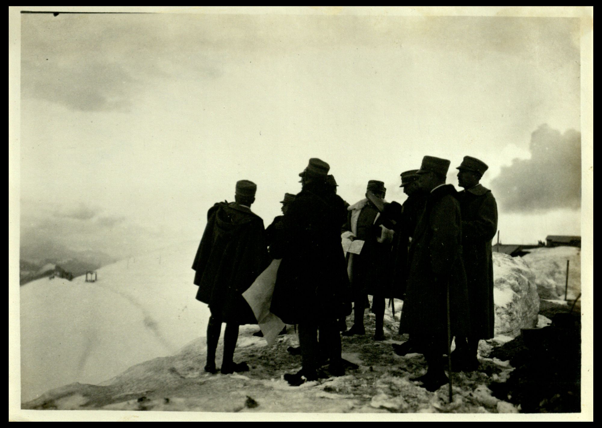 Il generale Lugi Cadorna tra un gruppo di ufficiali e soldati |