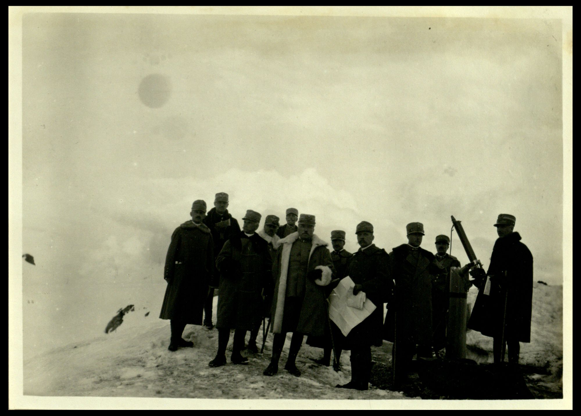 Il generale Lugi Cadorna tra un gruppo di ufficiali e soldati |