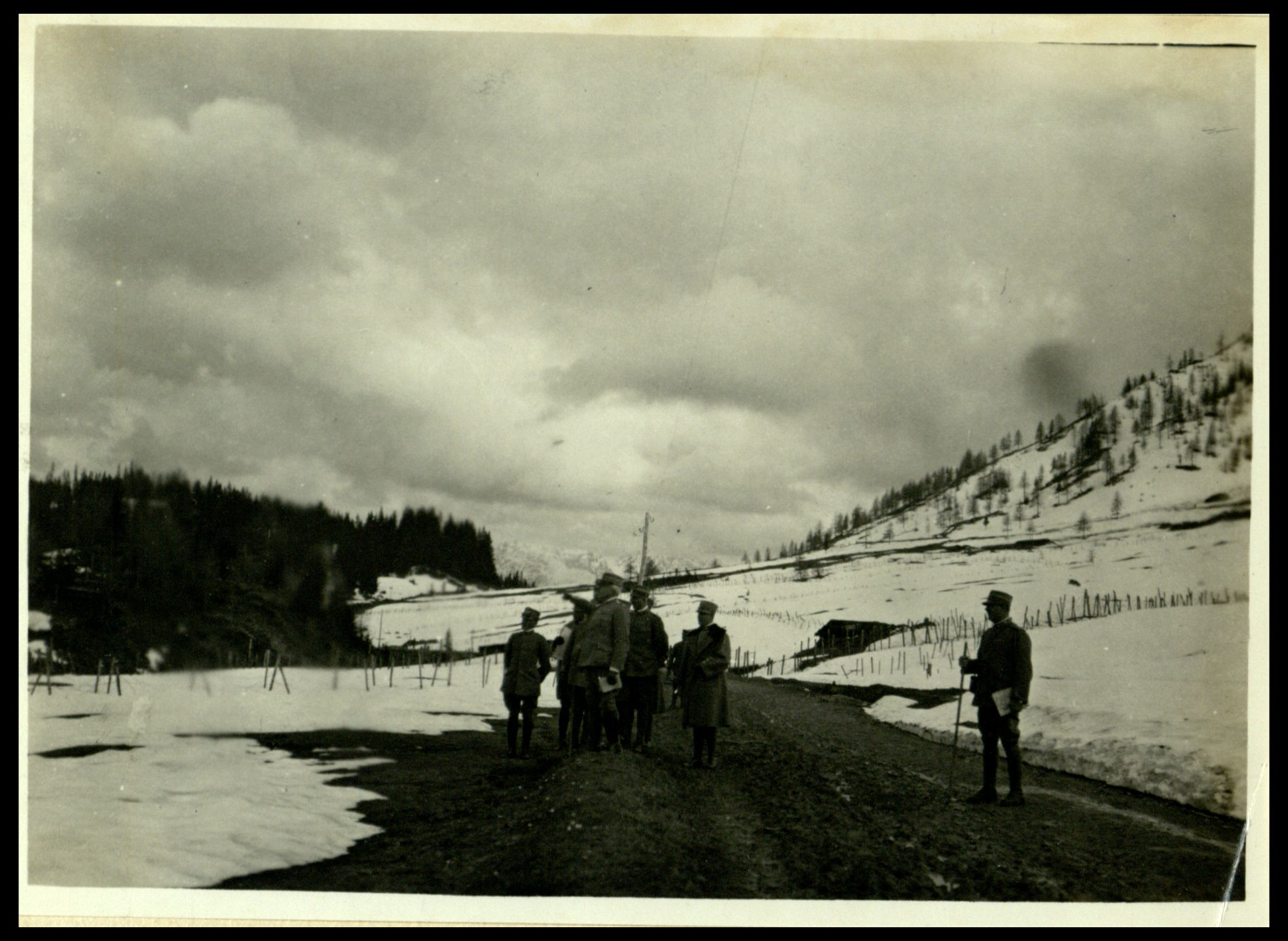 Il generale Lugi Cadorna tra un gruppo di ufficiali e soldati |