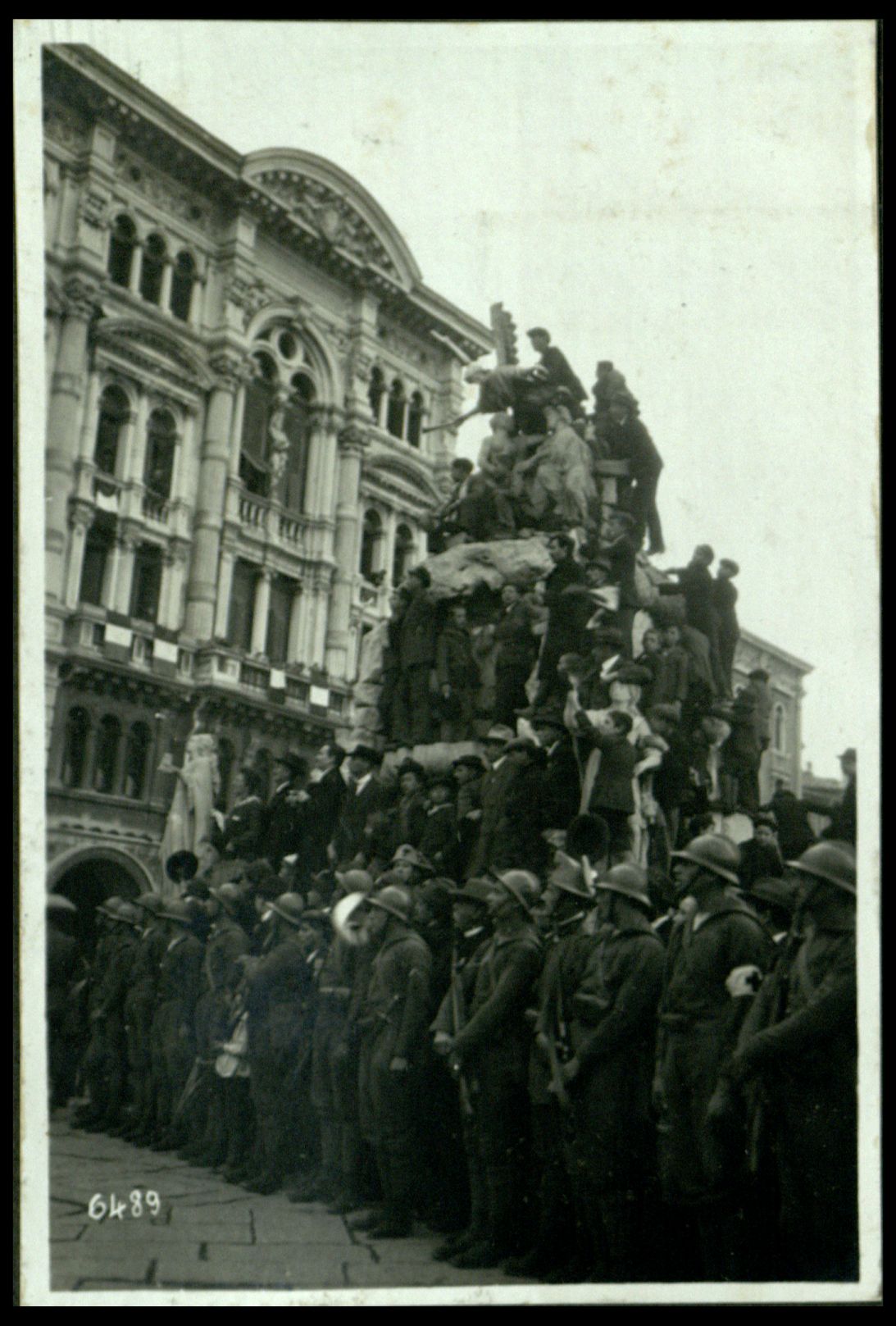 La folla davanti al municipio di Trieste in attesa che il Re si affacci |