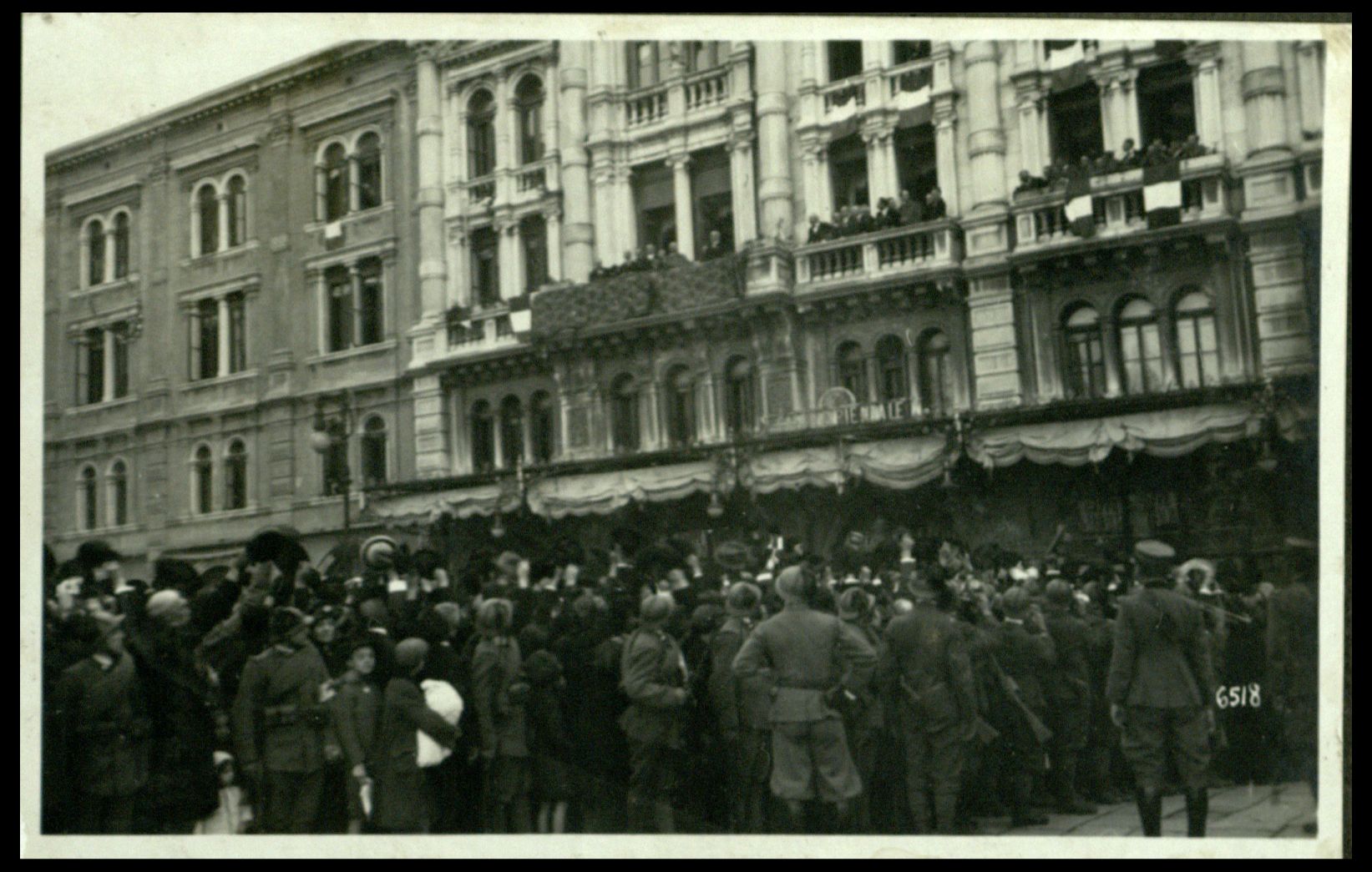 La folla acclama S.M. sotto i balconi del palazzo del Municipio |
