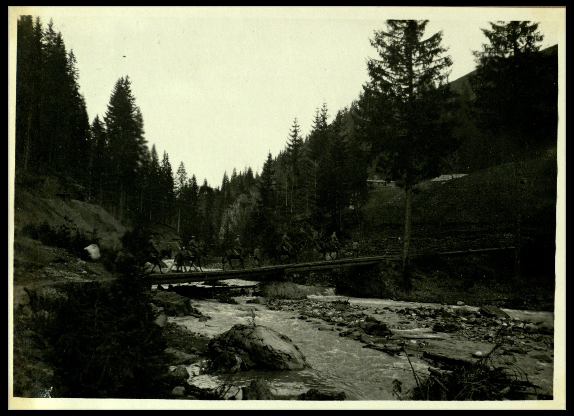 Paesaggio, soldati, cavalli e pontile |