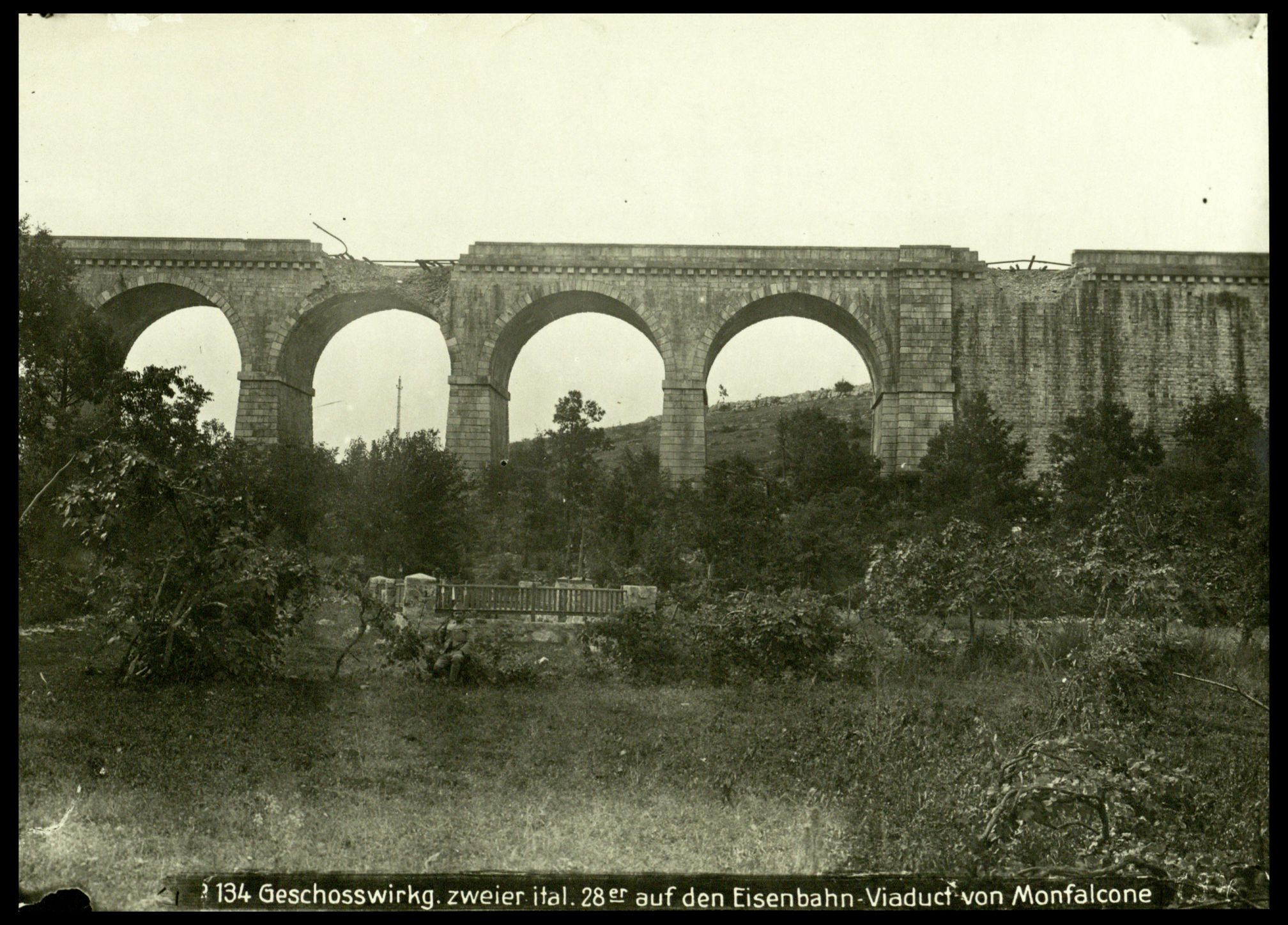 N°134 Geschosswirkg. zweier ital. 28. er auf den eisenbahn-viaduct von Monfalcone. Fotografia dell'esercito Austro-Ungarico |