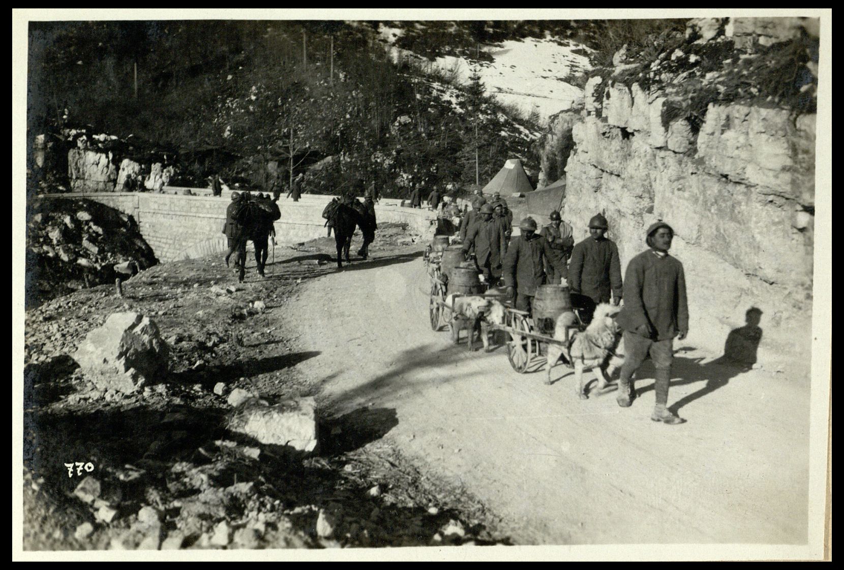 I rifornimenti d'acqua alle linee a mezzo di carretti trainati dai cani. |