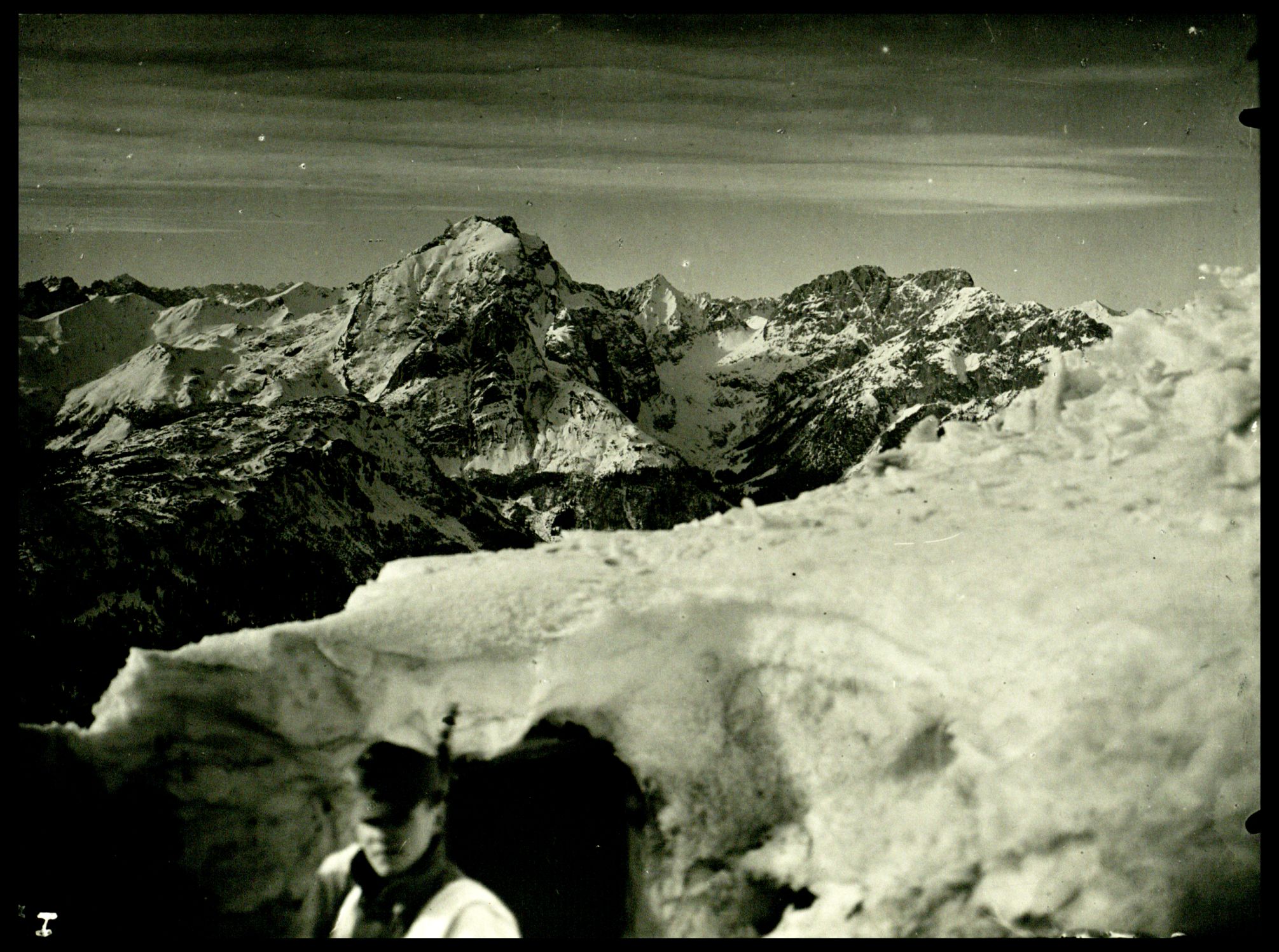 Panorama alpino. Fotografia ripresa da trincea con soldato in primo piano |