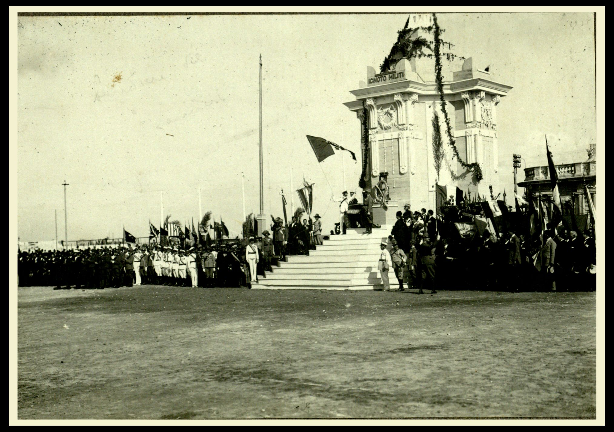 Tripoli. Mentre le truppe presentano le armi, la bandiera di combattimento del "Lanciere" viene issata sull'ara votiva |