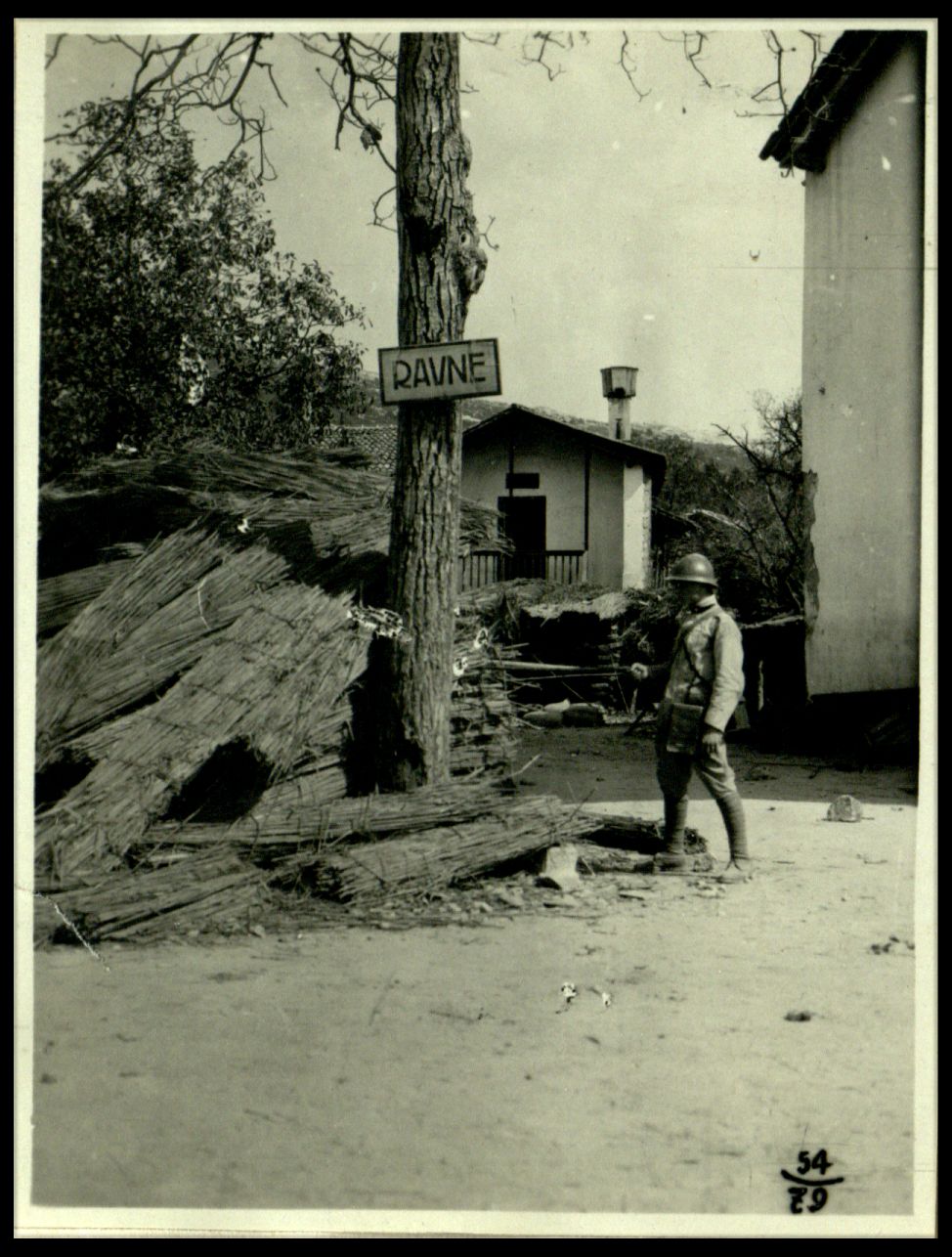 Tabella indicatrice del paese di Ravne e materiale bellico abbandonato |