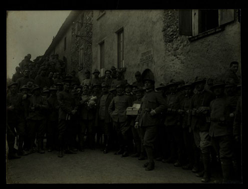 Gruppo di alpini davanti ad una Casa del Soldato della regione di Brescia. |