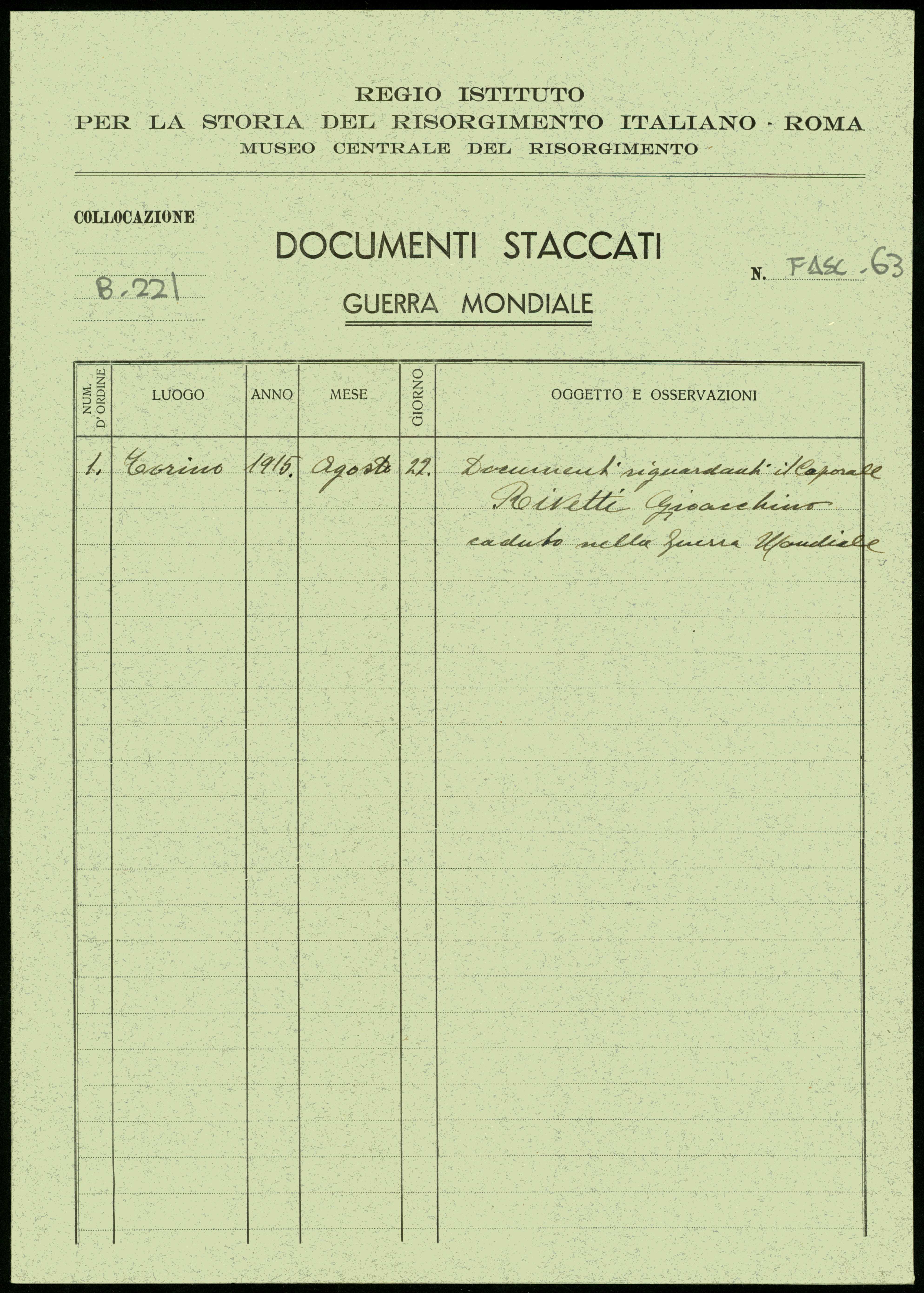 Istituto per la Storia del Risorgimento Italian.../Fondo caduti prima guerra mondiale/Riscosso Eugenio - Riviera Pietro/Rivetti Gioacchino, Brà (Cuneo)