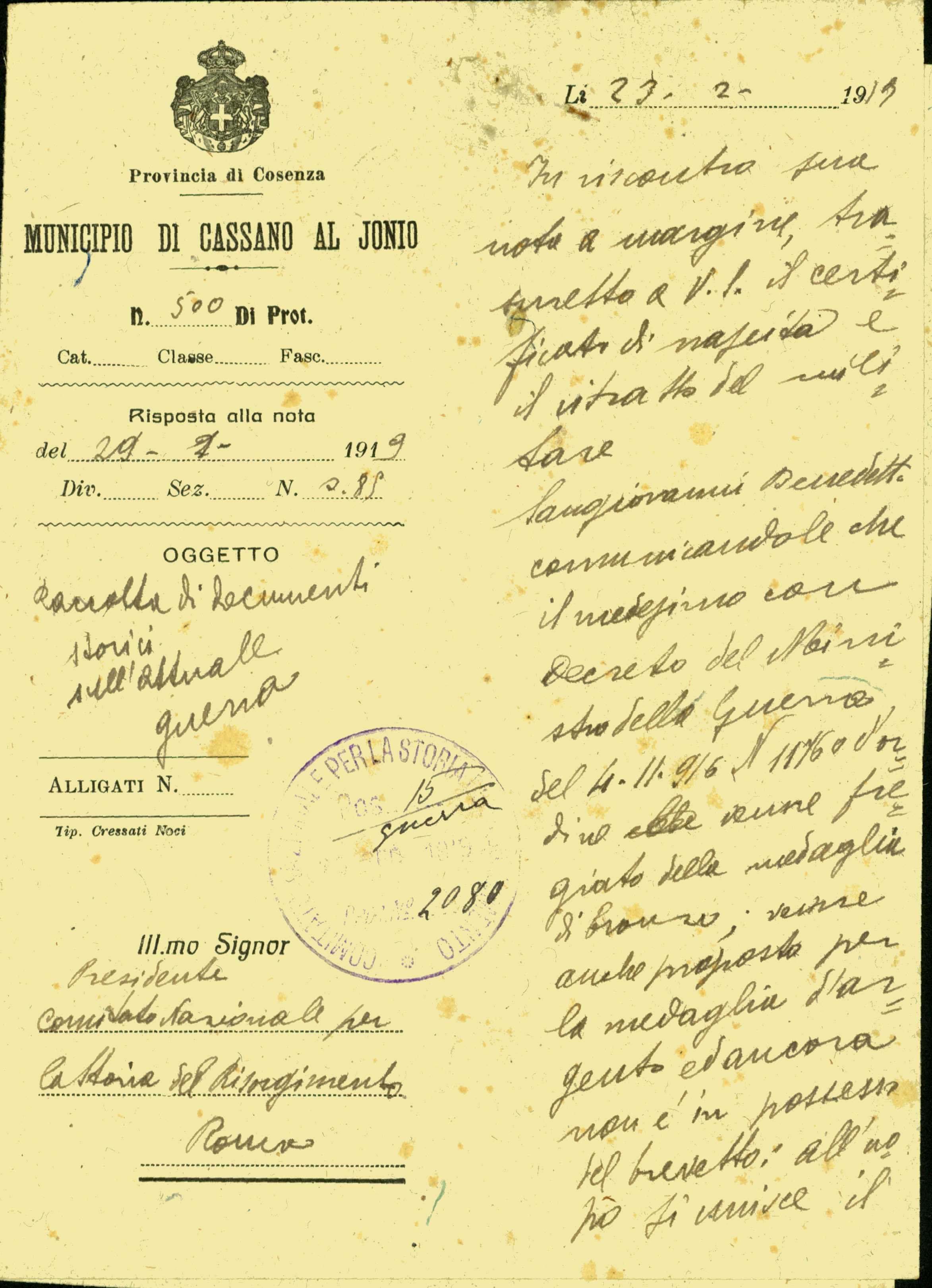 | Percorso: Istituto per la Storia del Risorgimento Italian.../Fondo caduti prima guerra mondiale/Sandei Lazzaro - Sansovini Corrado/Sangiovanni Benedetto, Cassano allo Ionio | |||||||||||